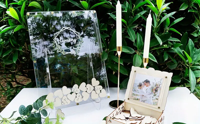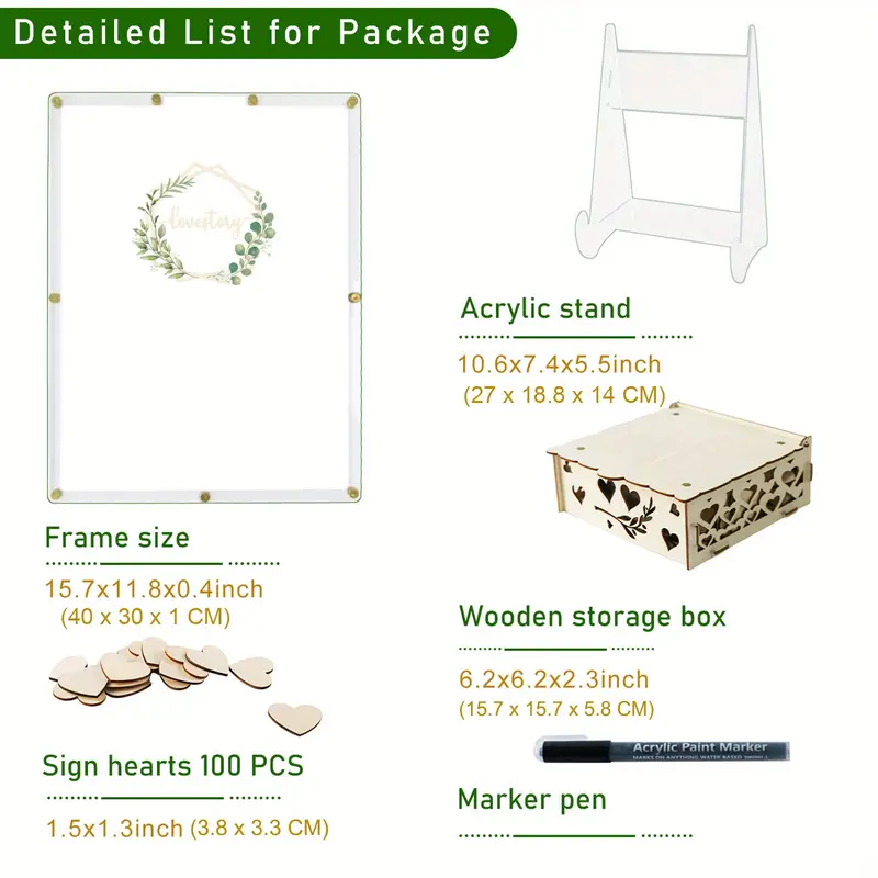◆WEDDING DECORATIONS FOR RECEPTION - You will get the value set of wedding guest book alternatives, including 1 clear acrylic drop top frame guestbook (15.7 x 11.8 in)(40*30cm), 1 x clear acrylic stand (10.6 x 7.4 in)(27*18.8cm), 1 x wooden storage box (6.2 x 6.2 in)(15.7*15.7cm), 100 pieces of wooden hearts, 1 marker pen. They are unique wedding reception decorations to create a perfect party
