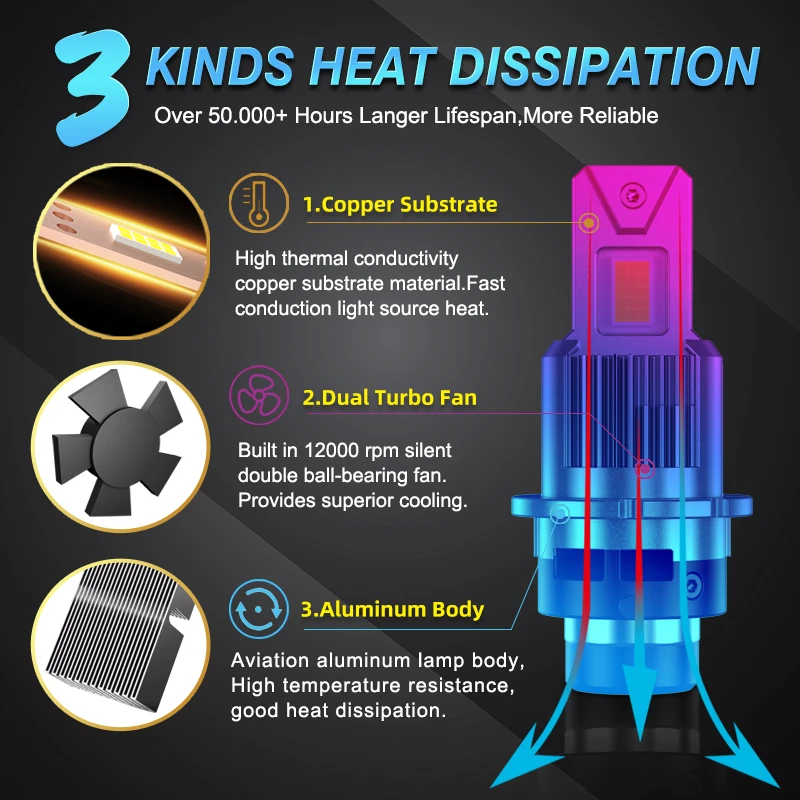 3. Heat transmission is quicker with the original nickel-plated double thermal conductivity copper tube and pure copper substrate. Meanwhile, thanks to the aviation aluminum shell and high-speed turbocharged fan, the heat can efficiently be dissipated and the life span of bulb is more guaranteed to be over 30,000 hours.