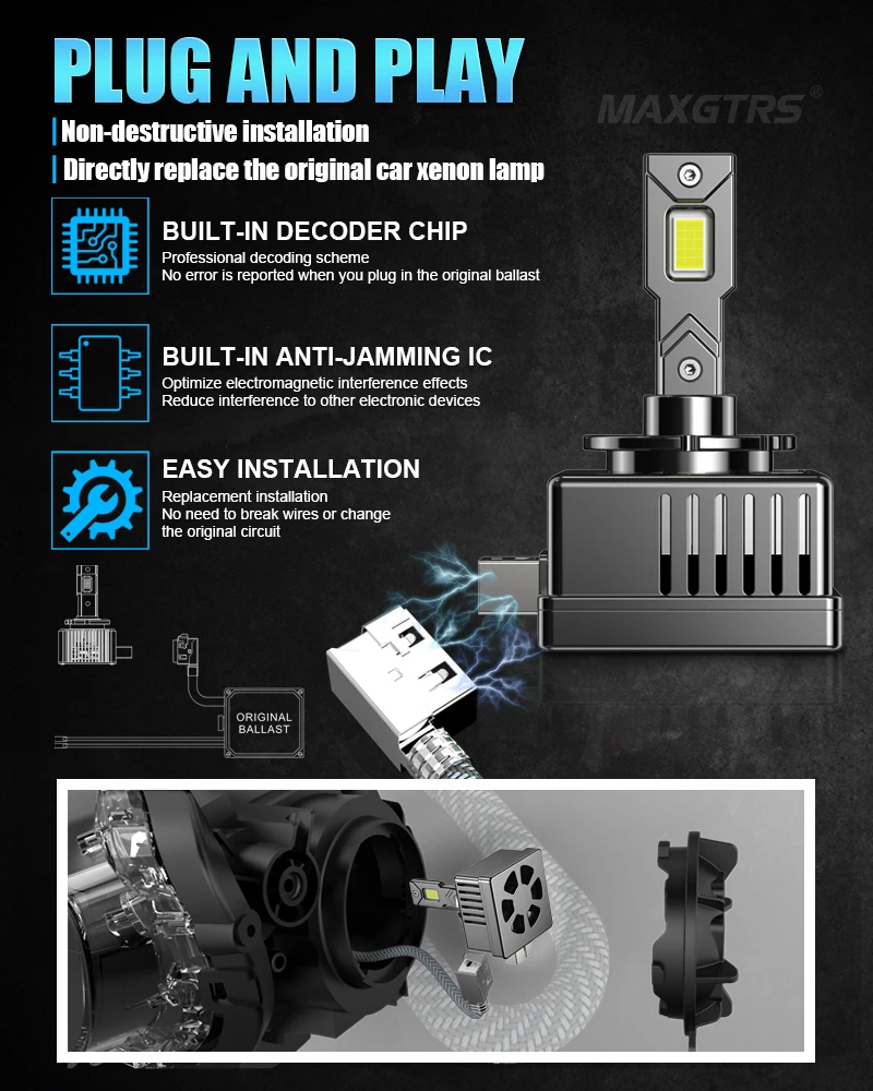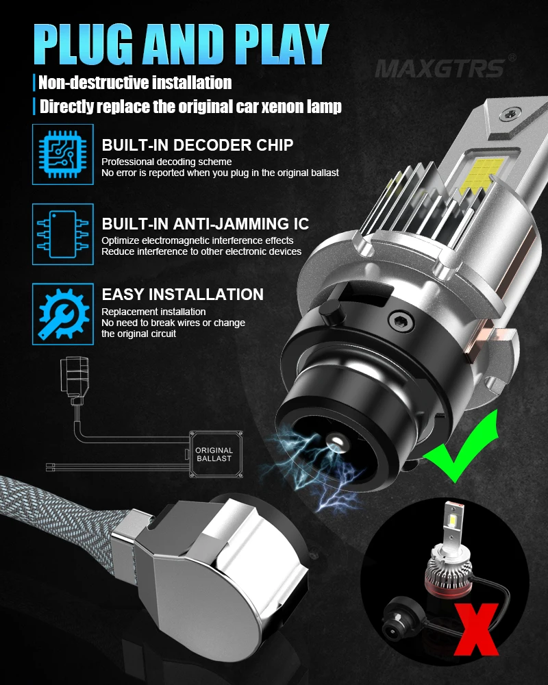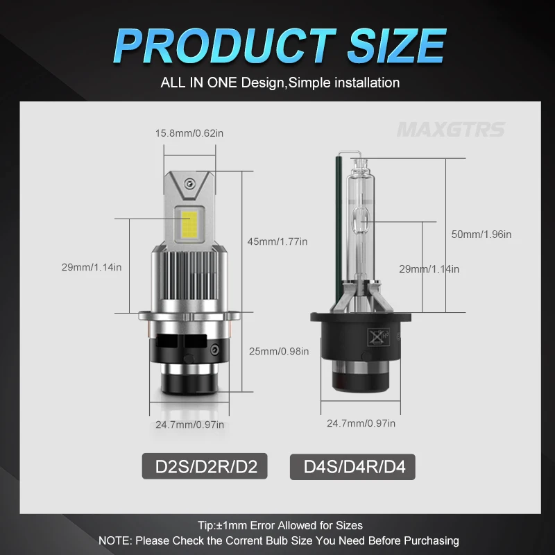 2. D2S D4S LED bulbs feature all-in-one design and can be used directly with D2S D4S HID ballasts without any wiring modifications, allowing installation easier. They can be applied to any headlight assembly that has either a projector or a reflector. The bulb in a projector headlight assembly stays lit all the time, and the projector, rather than the bulb, controls the function of high and low beam.