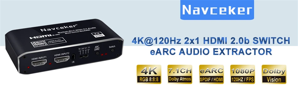 ZY-AV2E,Navceker 2x1 4K 120Hz HDMI 2.0 Switch eARC Audio Extractor is a high performance 2 HDMI input and 1 HDMI output switch with audio out .HDMI /Toslink/3.5mmjack audio output support audio extract function , AUDIO ONLY HDMI /Toslink /Coaxial support ARC (Audio Return Channel),AUDIO ONLY HDMI support eARC (Enhanced Audio Return Channel).The system supports all 3D TV formats in addition to all HDTV formats up to 4Kx2K@60/120Hz RGB 8 :8 :8 .