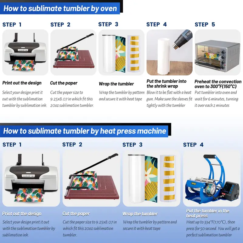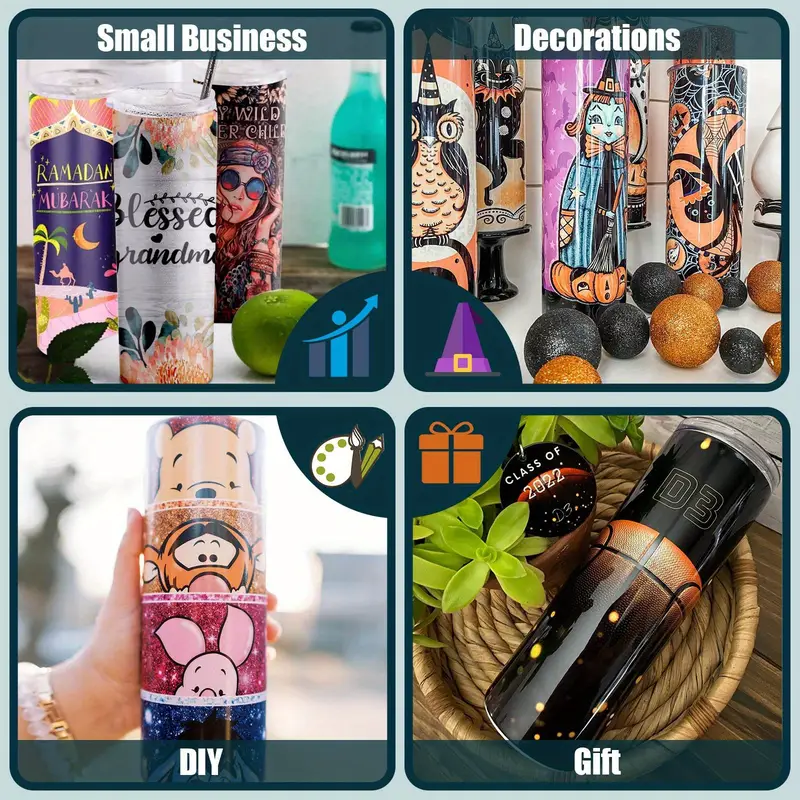 How to operate: Select the required picture and print it out, attach the pattern paper to the cup with heat-resistant tape, then cover the shrink film on the outside of the cup, use a hot gun to close the shrink wrap sleeve to the cup, and then put it in the oven, waiting for about 338F / 170 degrees Celsius,5 minutes to finish, simple to save your time and energy.