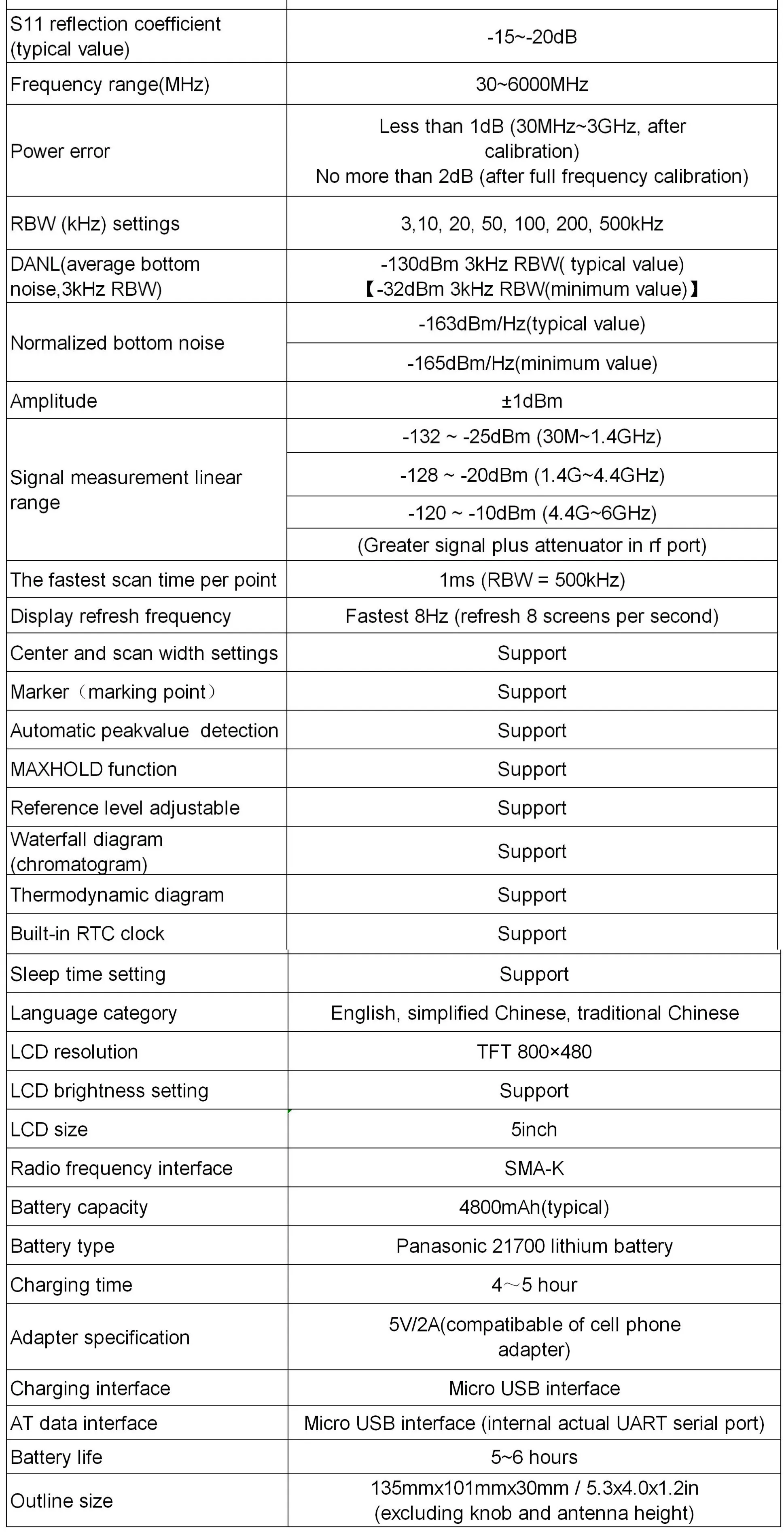 Real-time spectrum curve scanning, you can set SPAN (span)/RBW (resolution bandwidth)/CENT (center frequency)/MARKER (marker) function, or set the start and end frequency, MAXHLOD (maximum value) Hold) function, maximum power (MAX/PEAK) automatic detection and identification functions.