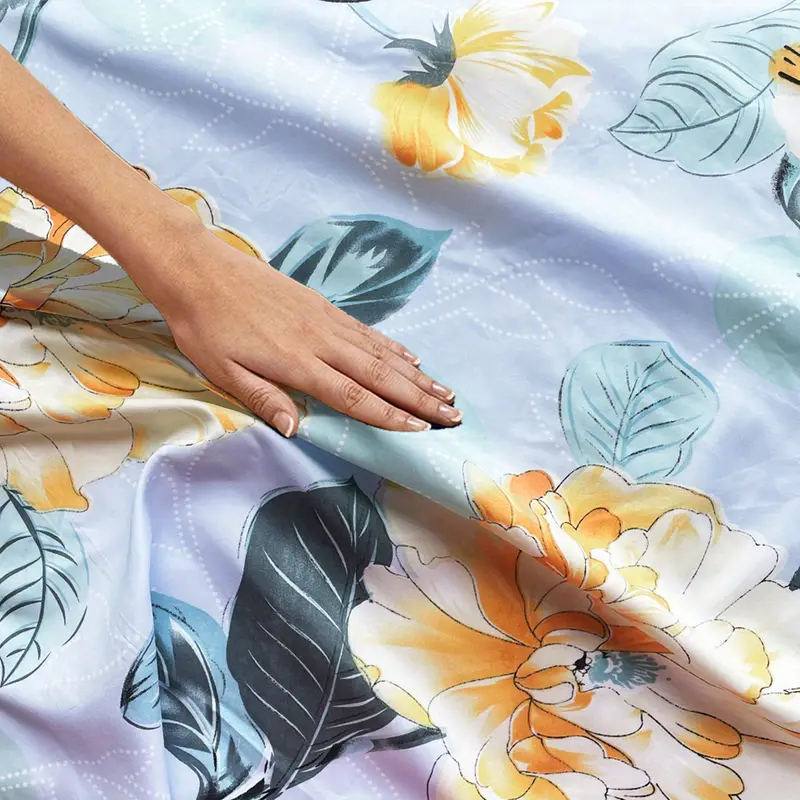 1 Printed Flat sheet, 1 Printed Fitted sheet, 2 Printed Pillowcases, and 2 Solid Pillowcases