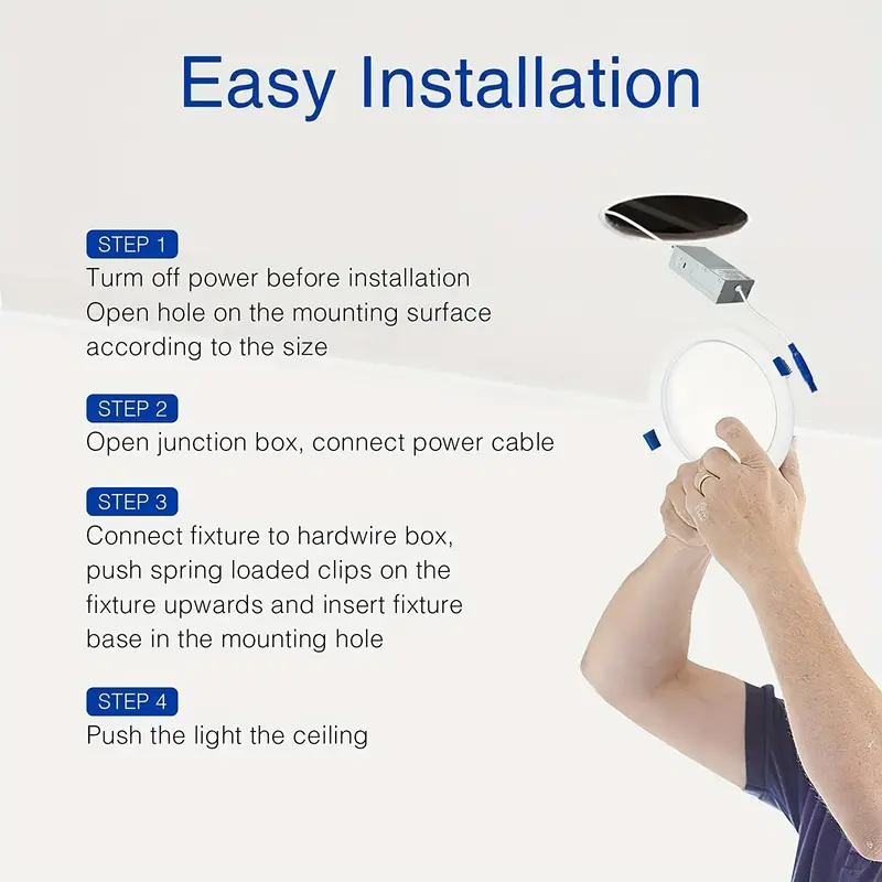 【EASY-TO-INSTALL】 NO can needed, easy retrofit or new construction installation, Our 6" LED recessed downlight design for a quick install. Just connect the provided J-box to the light using a male/female cable, and connect the reserved wire to the connector, then put the spring clip to the ceiling, install in seconds. (Please turn off the power supply before installation).