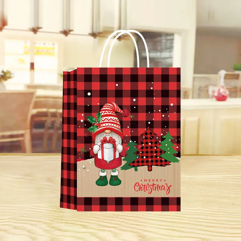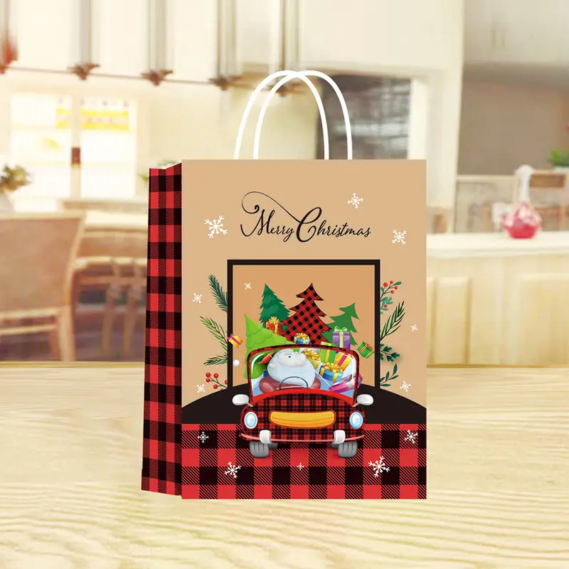 There Are 4 Styles Of Christmas Kraft Paper Bags, Which Are Printed With Christmas-themed Patterns Such As Christmas Tree, Santa Claus, Reindeer, Etc., Creating A Strong Christmas Atmosphere.