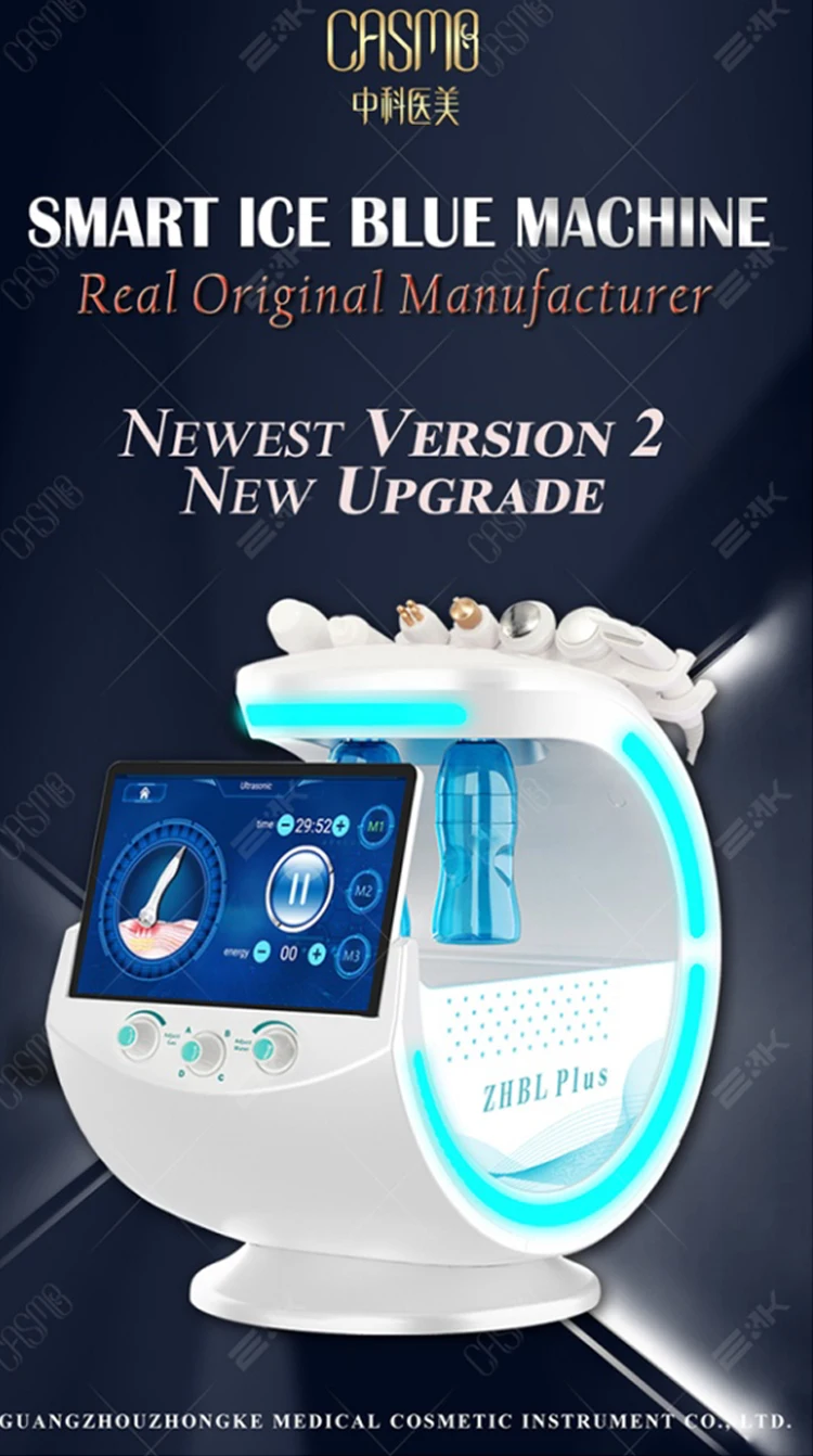 The intelligent ice blue skin management system is to collect facial skin detail images through 10 million pixel high-definition micro-range camera combined with three-spectral imaging technology, through intelligent diagnosis and analysis of artificial intelligence core engine ,8 dimension fine items to detect skin problems, and according to the diagnosis results of private customized beauty care program and intelligent recommendation of professional skin care products; Combined with the techniques of" ultrasonic shovel knife "," bubble "," nano atomization "," ultrasonic wave "," gold radio frequency "," ice repair "and so on, the six high configuration beauty functions comprehensively manage the skin, combine the results of AI skin diagnosis with skin care products and other skin care items, and develop a multi-functional integrated equipment for skin detection and management.