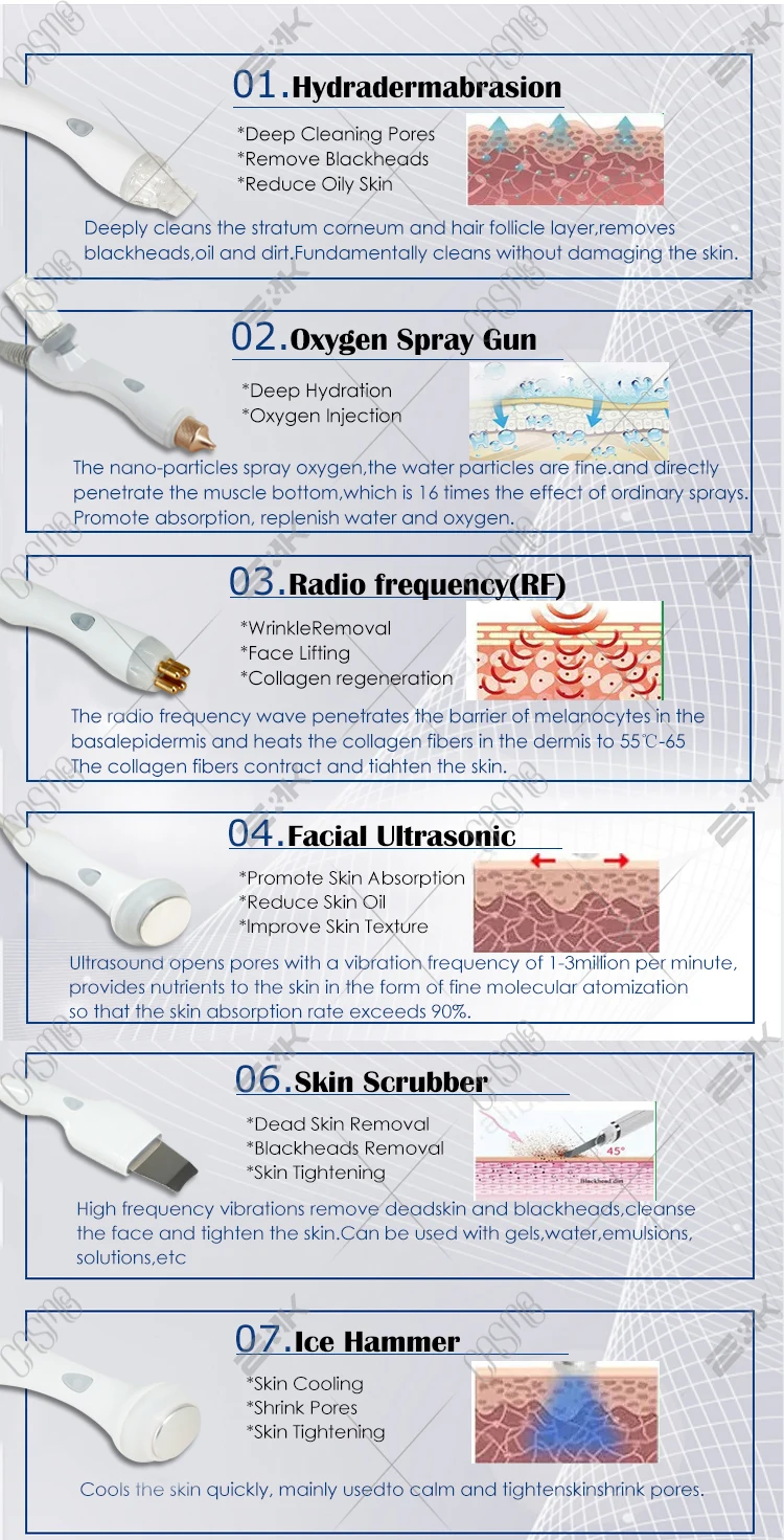 3) Functional principle: The core principle of this product is 3 spectrum sampling, AI intelligent skin measurement, AIintelligent product push, AI beauty program customization; six major care Functions: "ultrasonic spatula", "big bubble", "nano atomization",