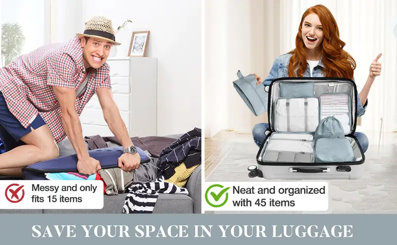 【8 Piece Compression Packing Cubes】Our suitcase organizer bags set come in various sizes to accommodate all your essentials, from clothes and shoes to cosmetics and electronics. The travel bags organizer for luggage make anything organized