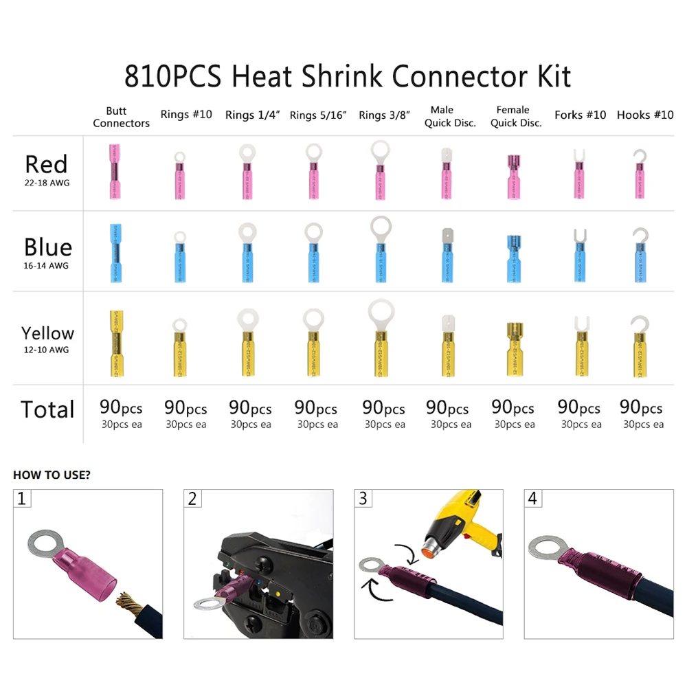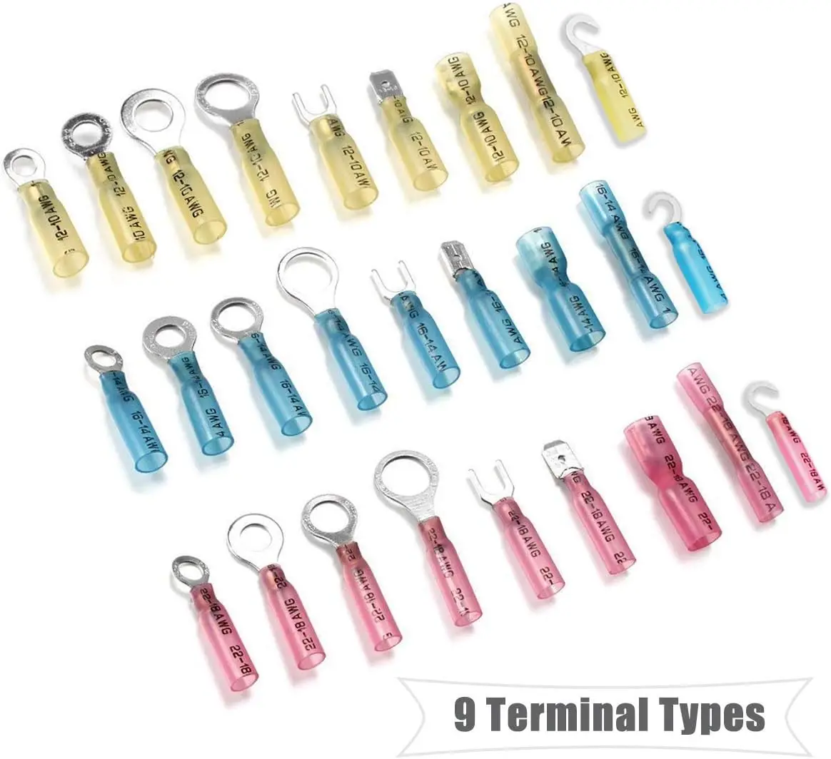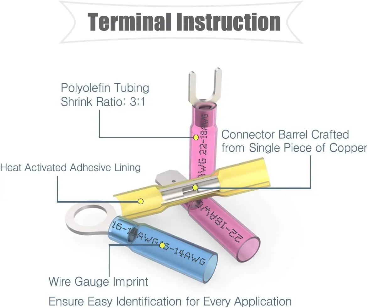 ♥ Ease of Applications - Strip wire insulation, crimp terminal barrel with a wire crimper, and apply heat with a heat gun while rotating a connector. Heat shrink tubing will reduce in size and adhere to the wire. No soldering kit needed. Start making secure and durable connections in seconds.