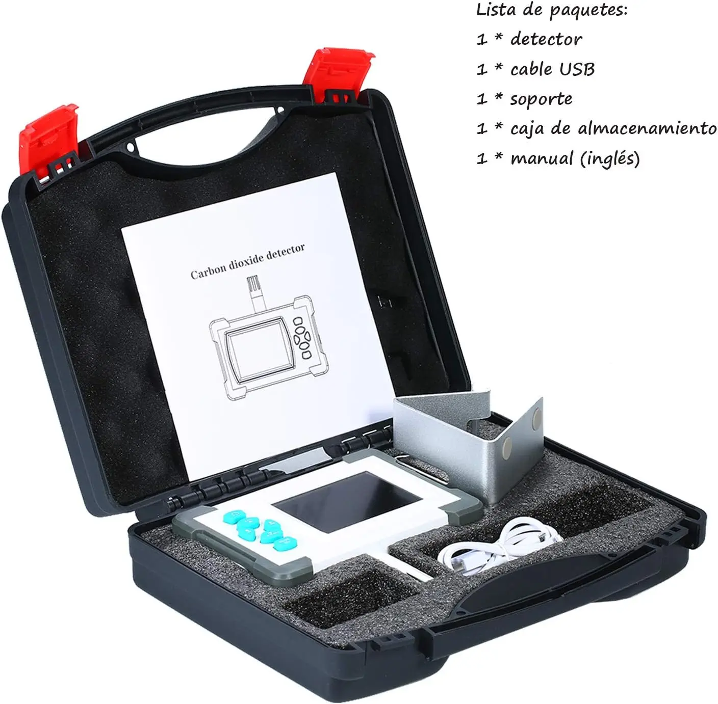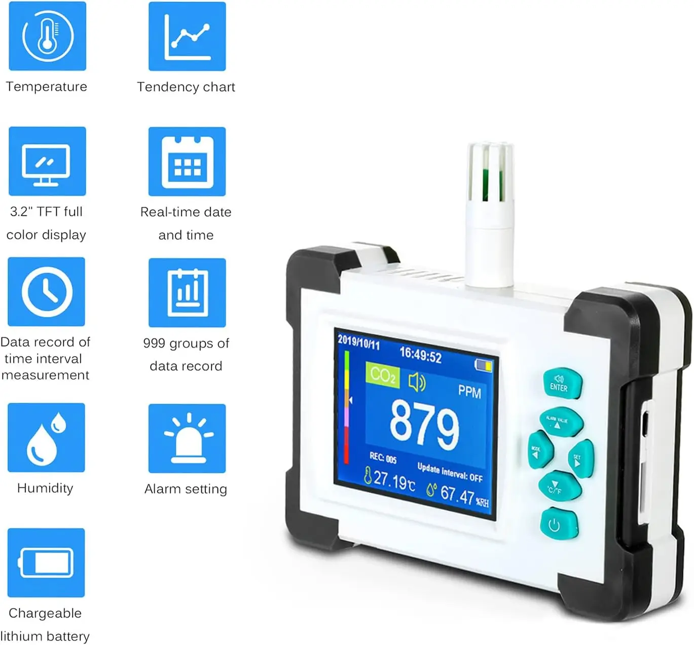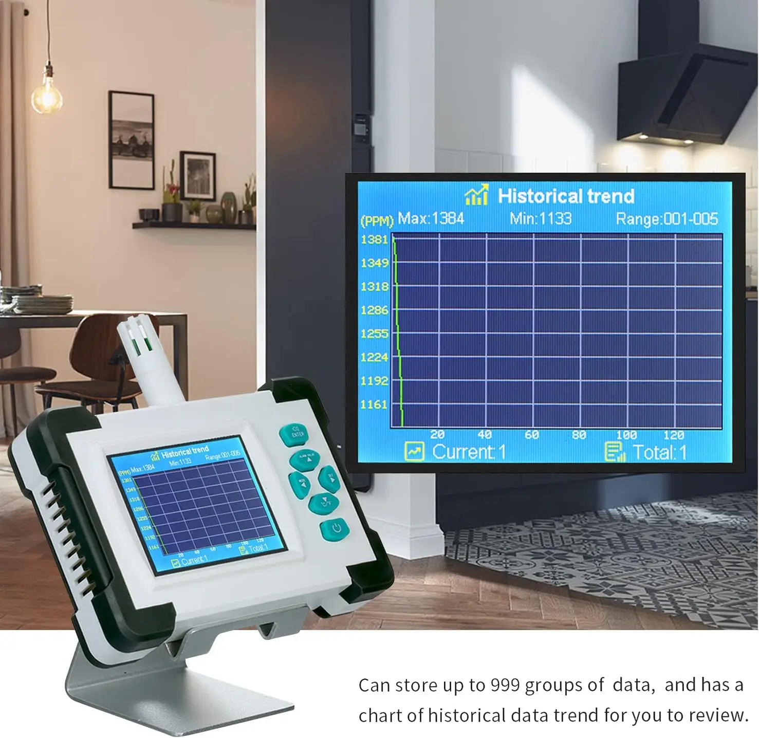 【Data Storage】Air quality tester can store up to 999 groups of data, and has a chart of historical data trend for you to review. CO2 monitor has a 2200mAh rechargeable lithium battery and packed with 5V USB cable.
