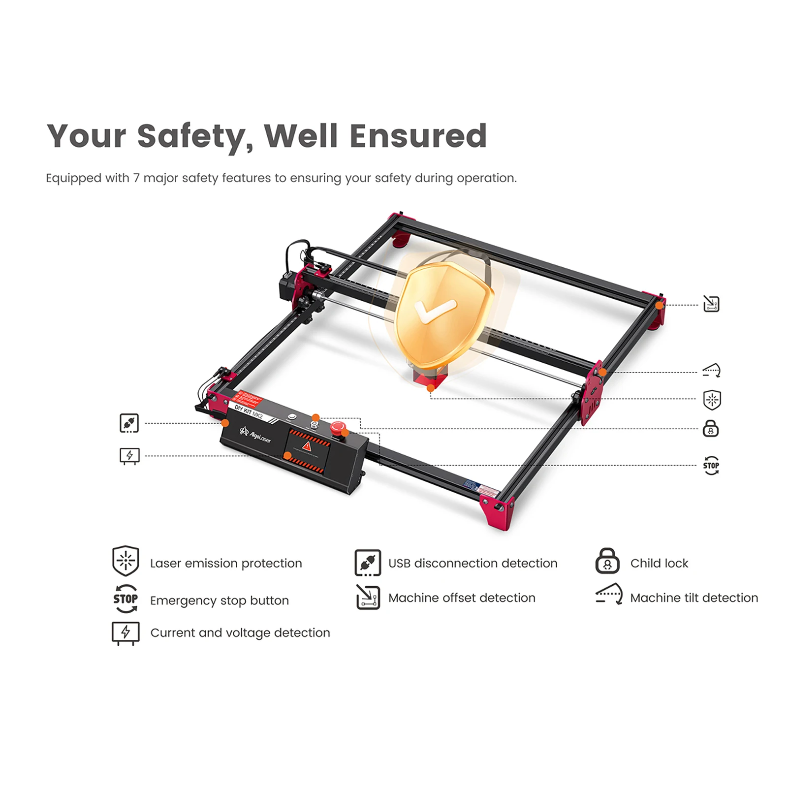 🔝 Safety Protections: Equipped with multiple detections to protect users, which including Emergency Stop Button, Safety Lock, Main Board Overheat Protection, Over-voltage & under-voltage protection; And Laser Goggle and Laser Shield design for enhancing the safety of laser use.