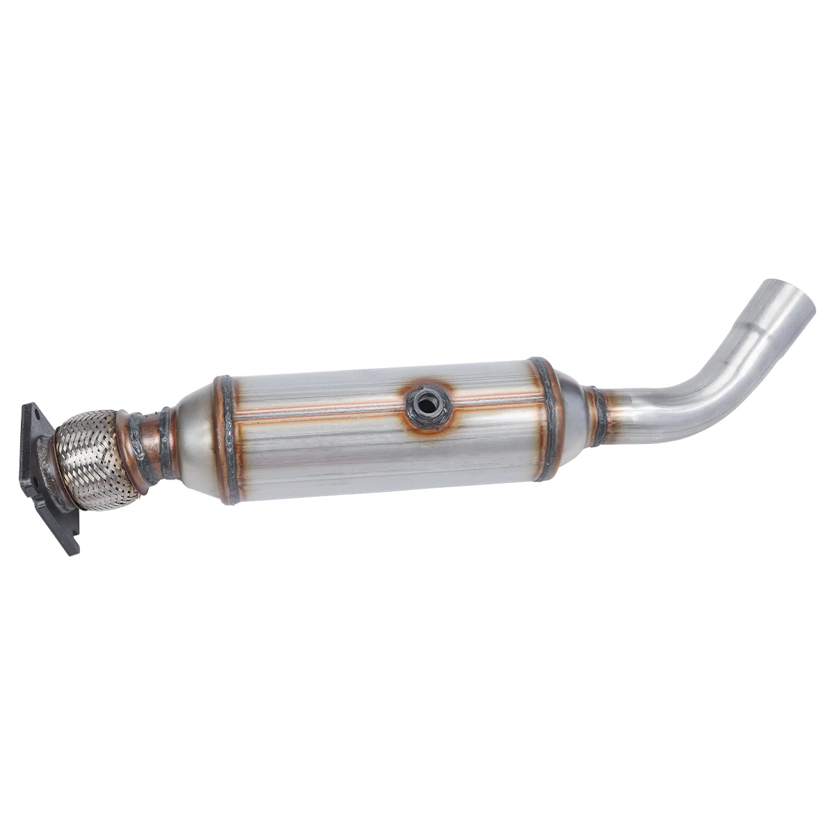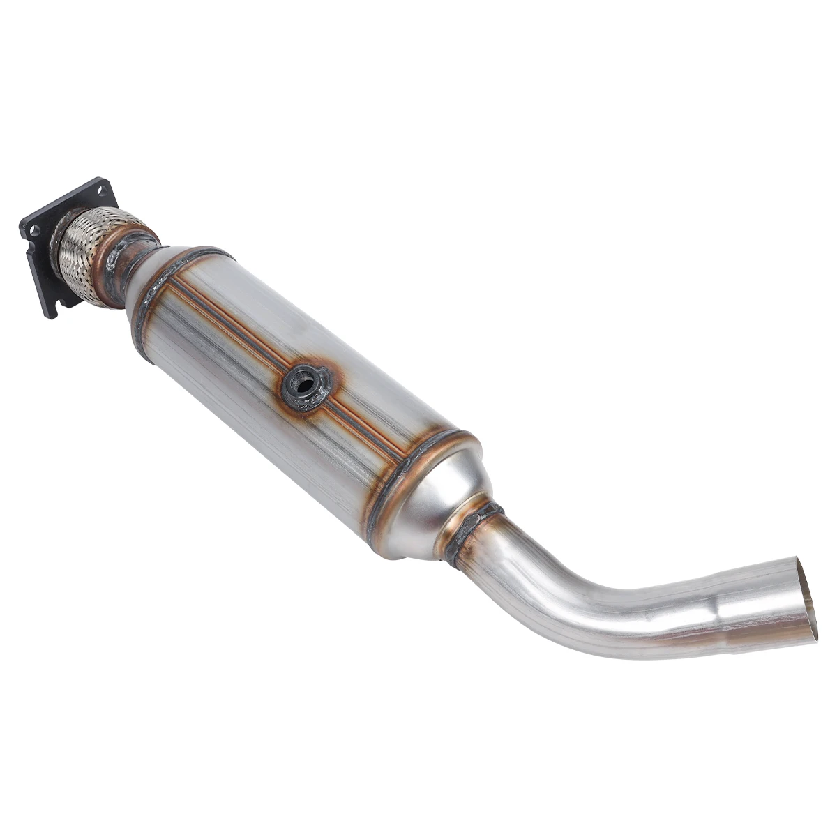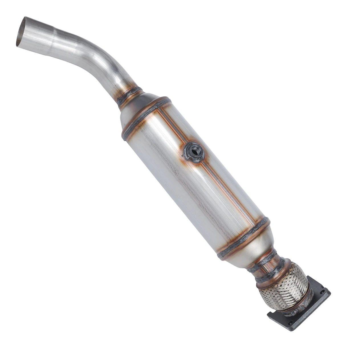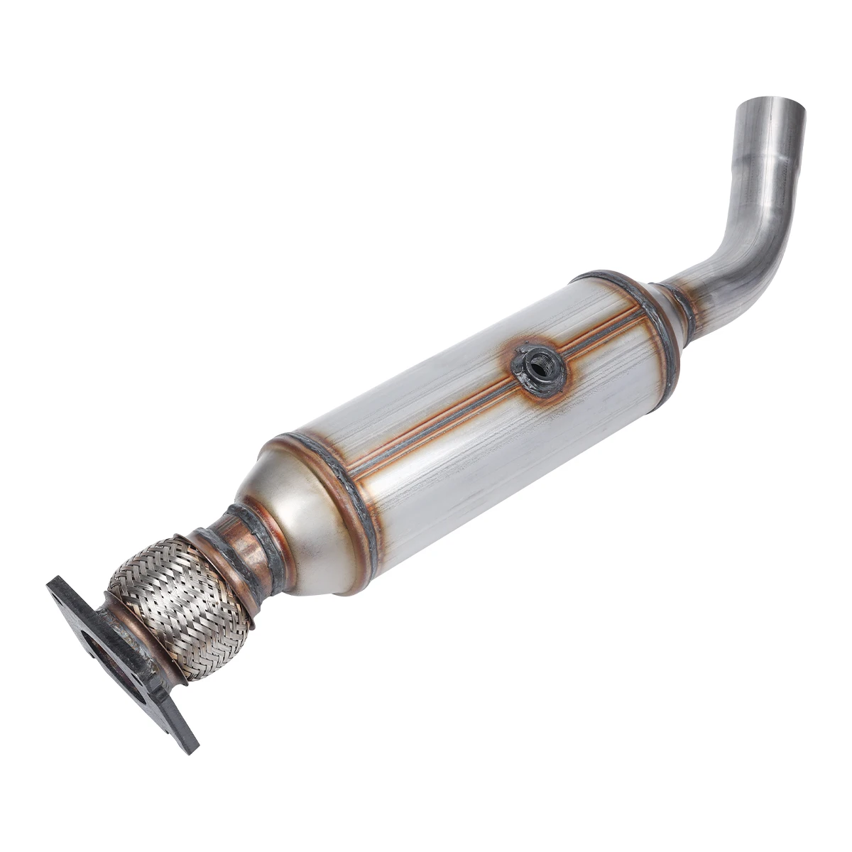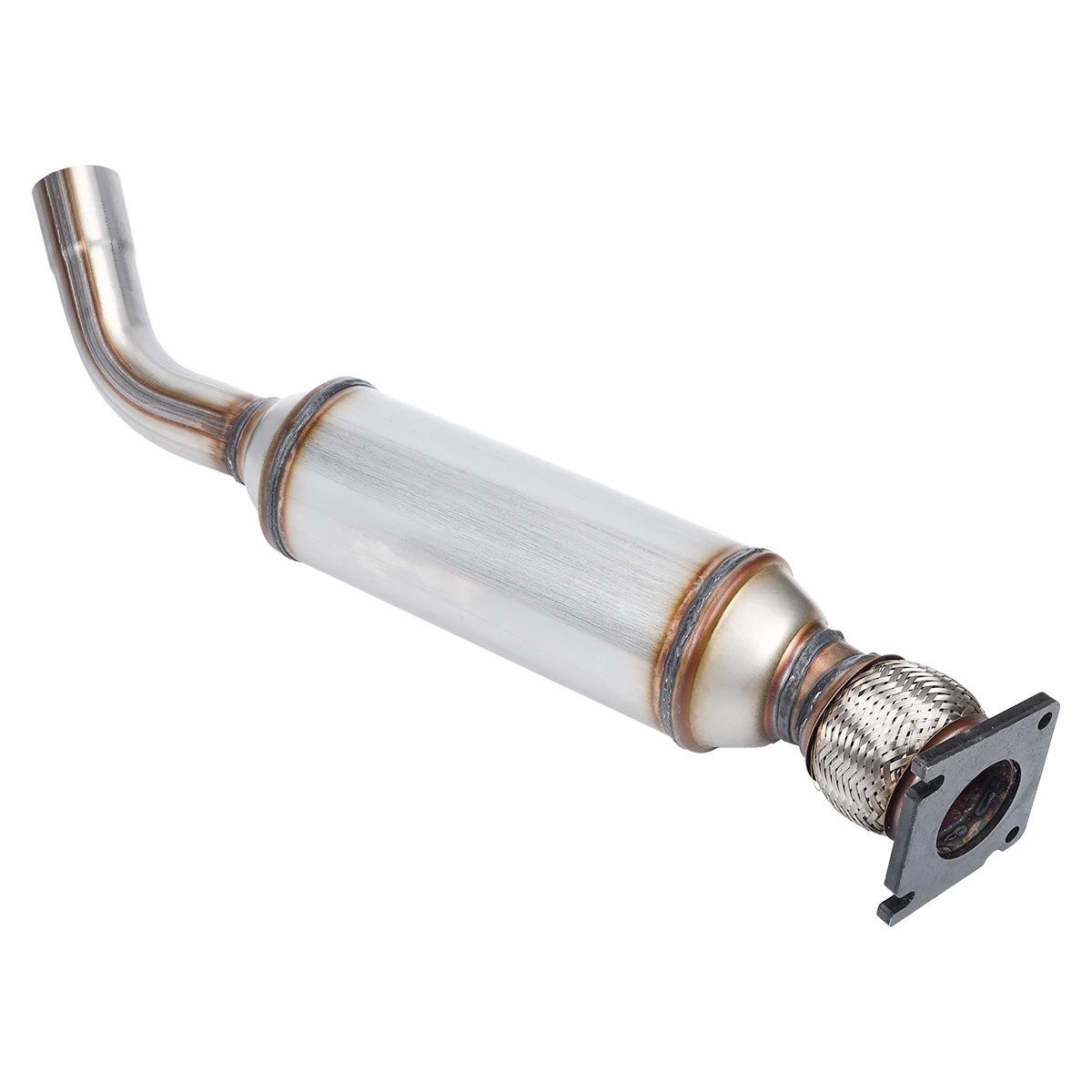 The pipe constructed from 14 gauge tubing, with original oe style heavy duty stainless flanges, inner braid flex pipe and high loaded OBDII by design catalytic converter