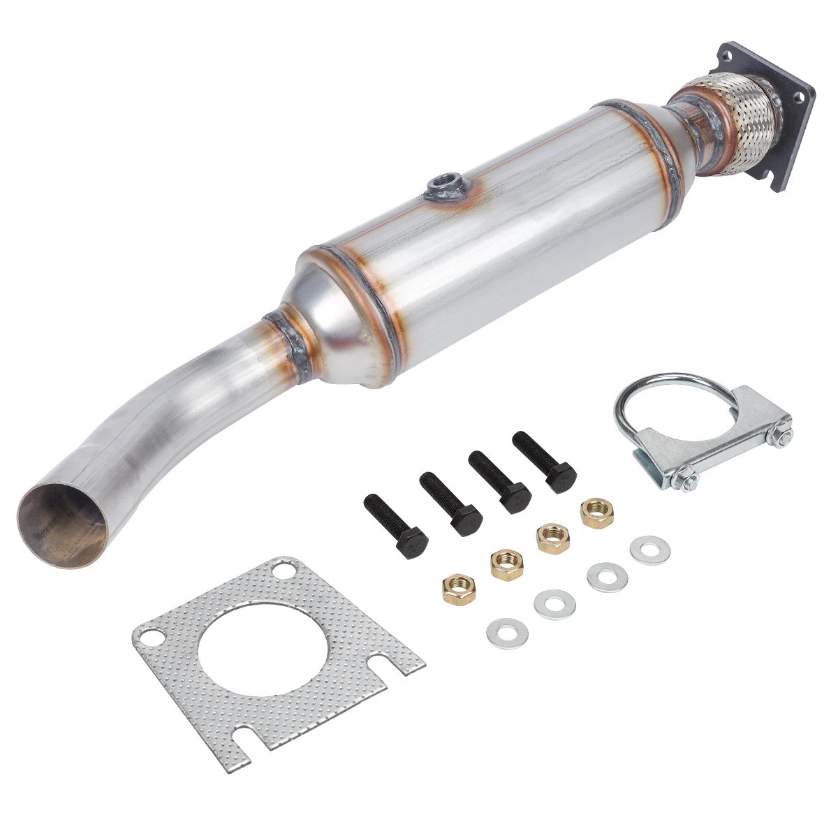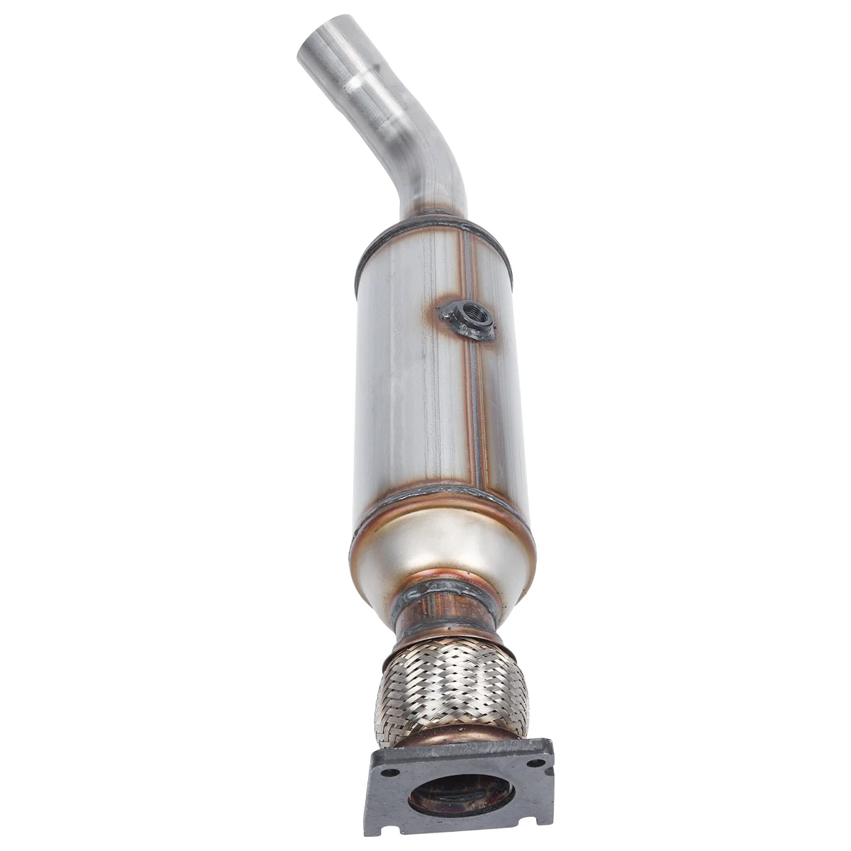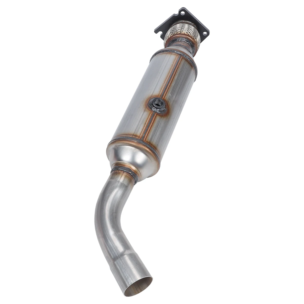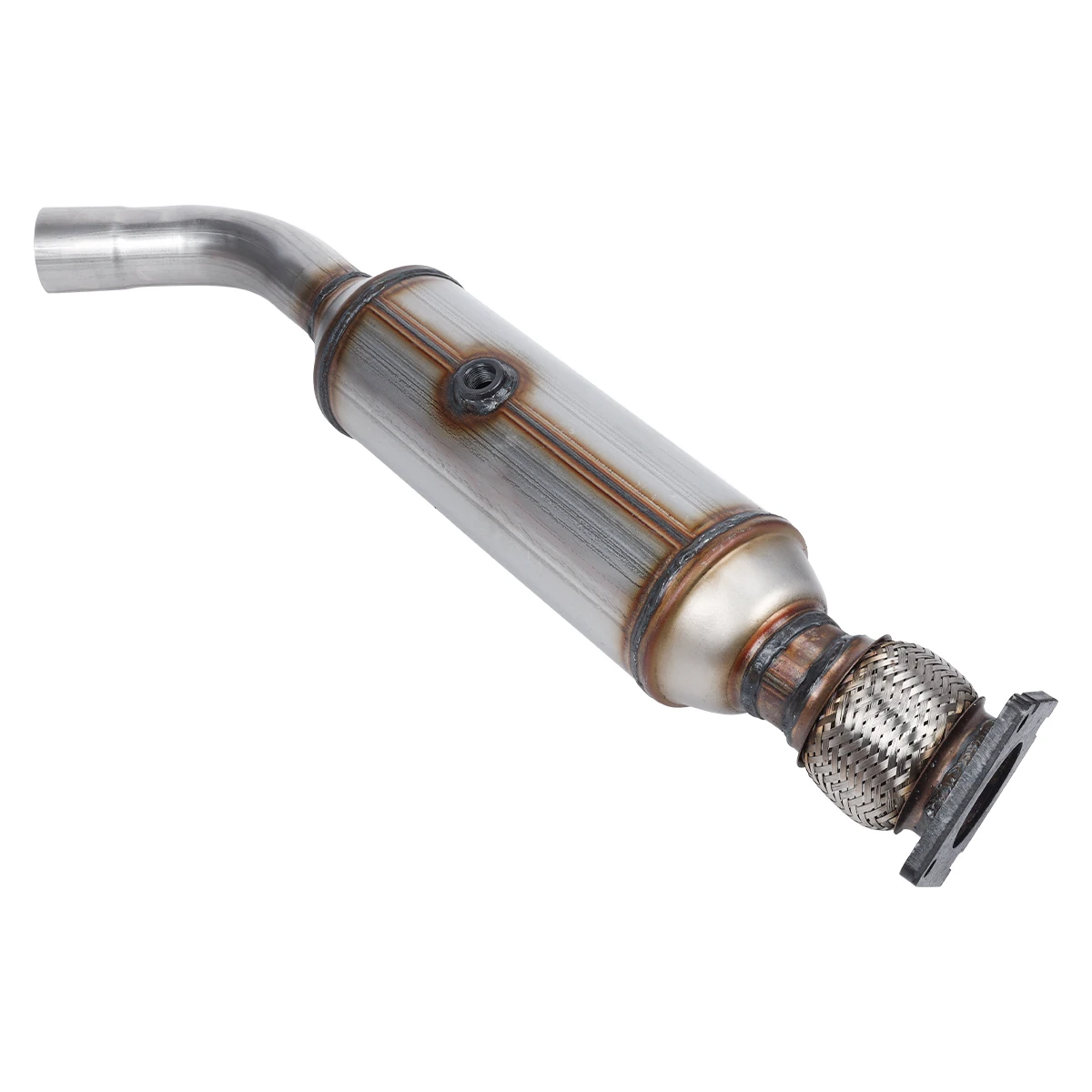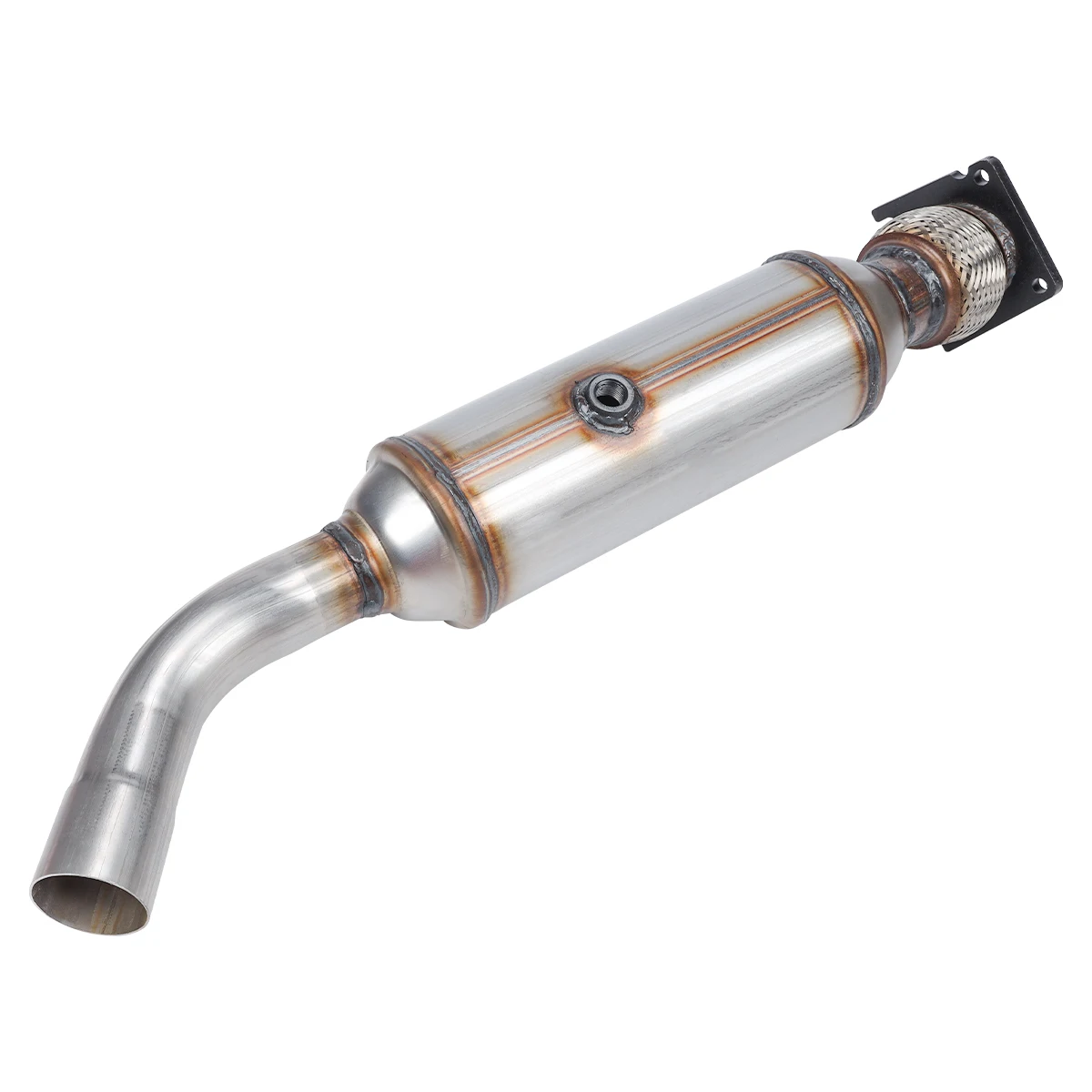 The pipe constructed from 14 gauge tubing, with original oe style heavy duty stainless flanges, inner braid flex pipe and high loaded OBDII by design catalytic converter