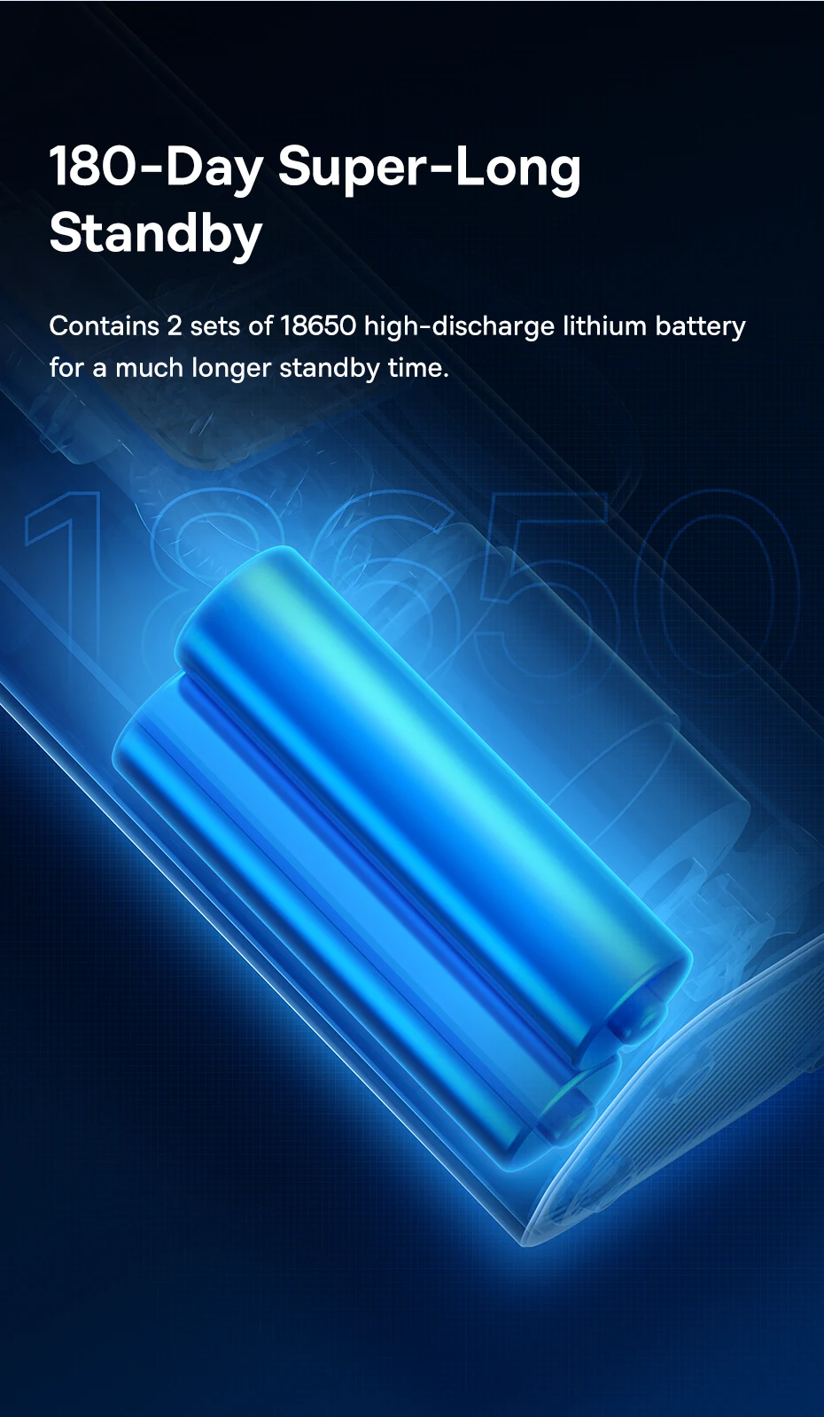 Contains 2 sets of 18650 high-discharge lithium battery for a much longer standby time.
