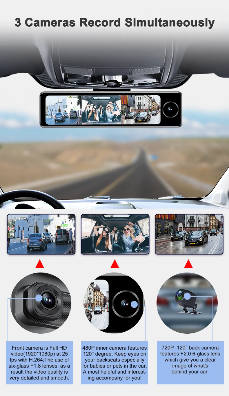 Premium 3 way car camera; front, inner and rear camera 3 channels are recording simultaneously; Full view, help the Uber or other drivers save the important evidence;