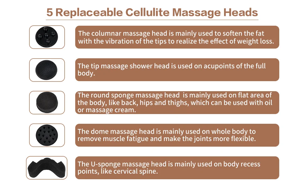 3. 5 different massage heads—— used for different areas and different treatment results.