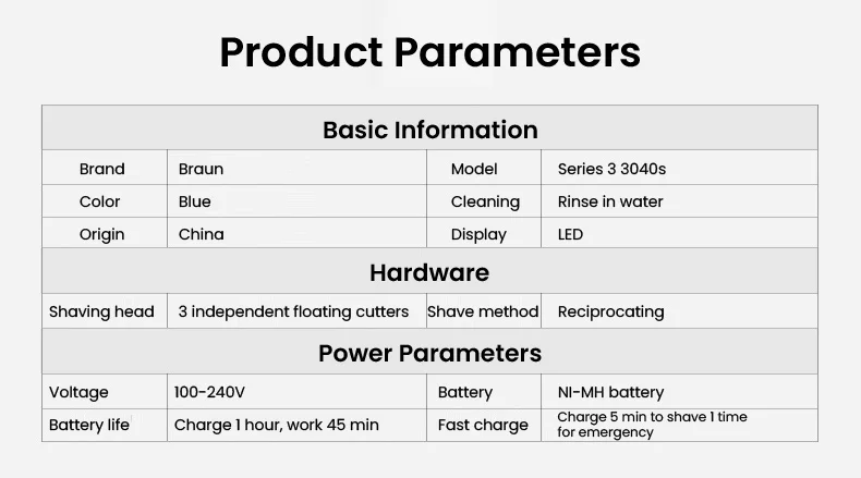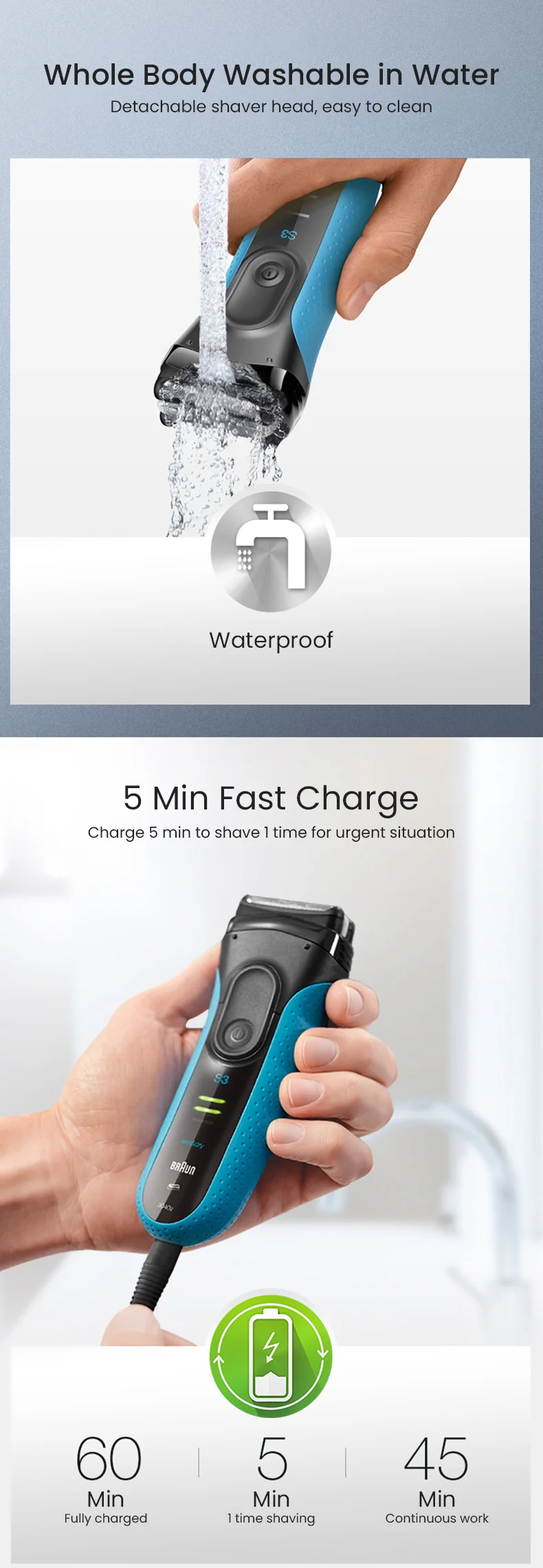 3. 5 min flash charge for 1 time urgent shaving. Fully charged in 1 hour, work 45 min continuously