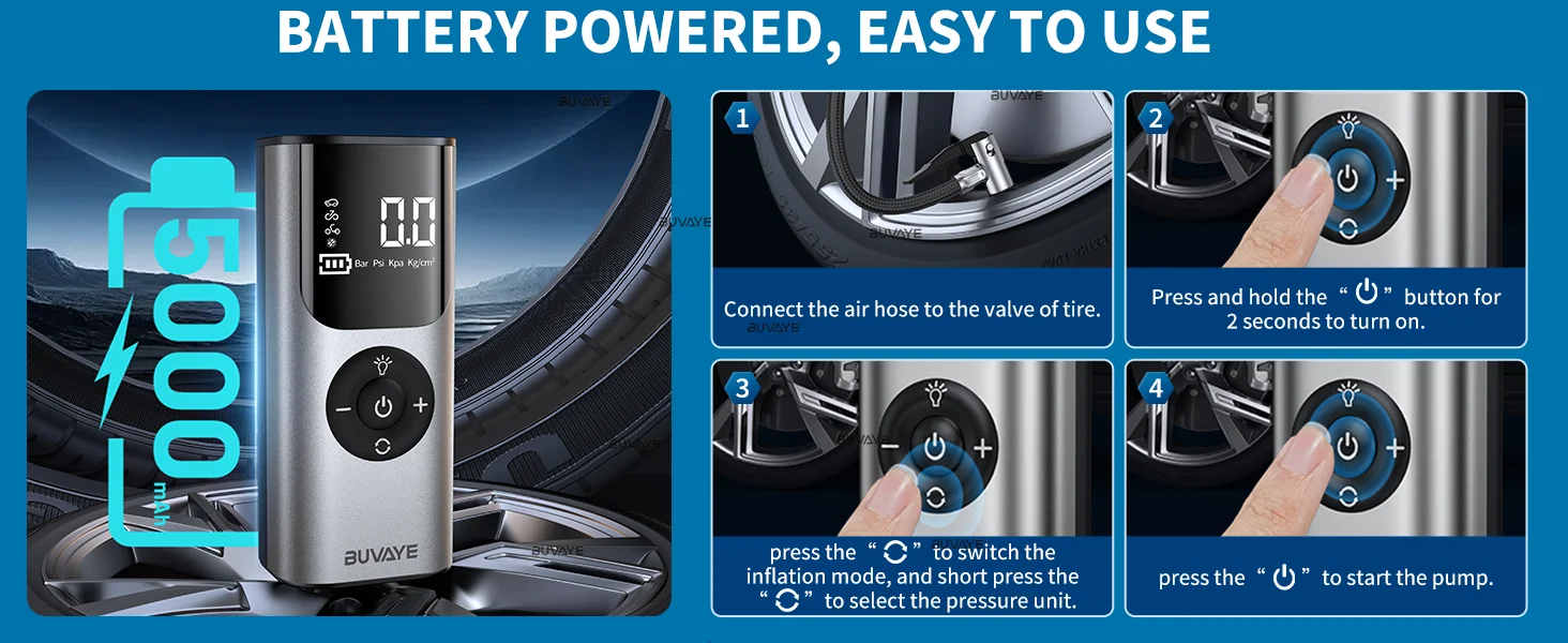 The tire inflator portable air compressor has a large built-in 5000mAh rechargeable battery. It allows you to inflate any device without external power and get rid of annoying power cords. Inflates 4 car tires from 0-36 PSI or 10 car tires from 28-36 PSI on a single charge.