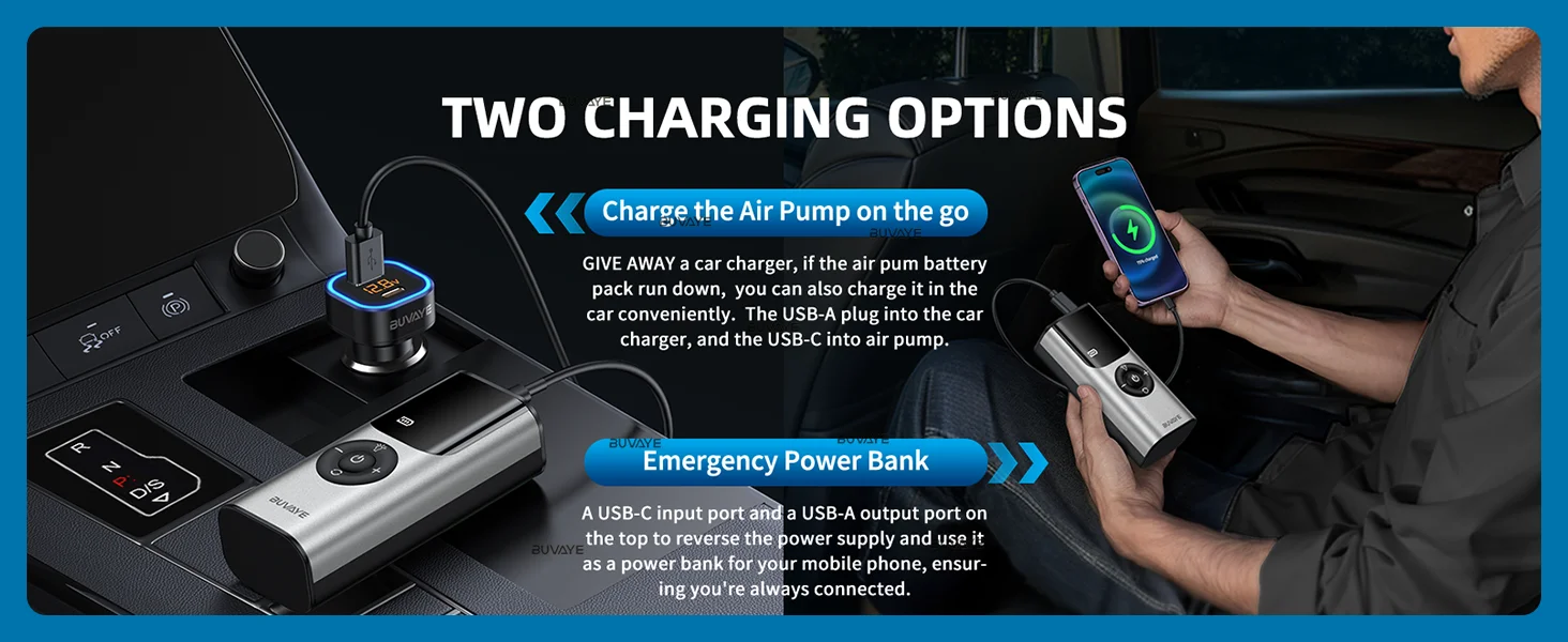 (1) When the device battery is sufficient, it can be used directly as a portable air pump. In addition, the 5V/2A Type C input and 5V/2A USB output port make it an emergency power source for your mobile phone.