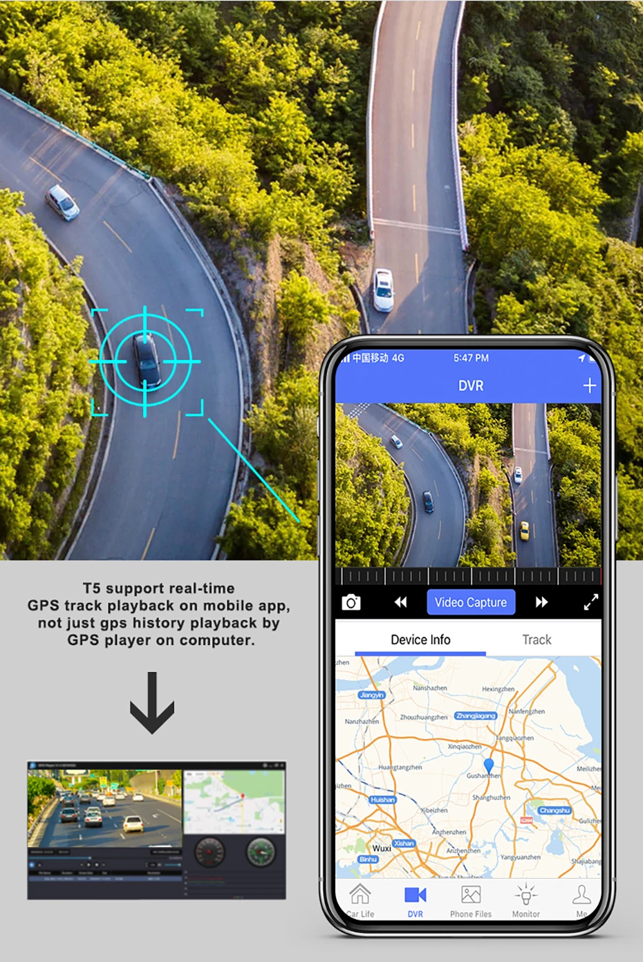 -Remote monitor on phone (T5 only supports phone APP, T5Pro supports phone app and computer desktop client )