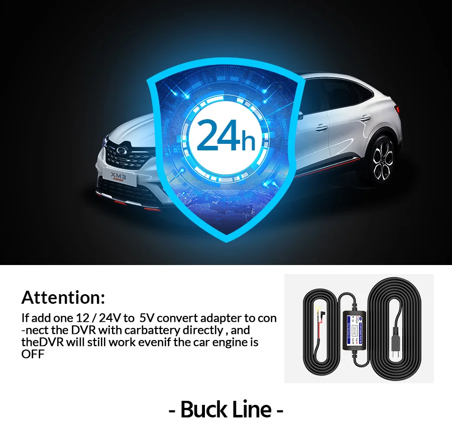 If you are worried about your car being damaged by someone else after parking, you can use our buck line to connect the DVR to ensure that the recorder works 24 hours.If someone else hurts your car and the shock triggers the G-sensor, the DVR will immediately turn on and record the situation.