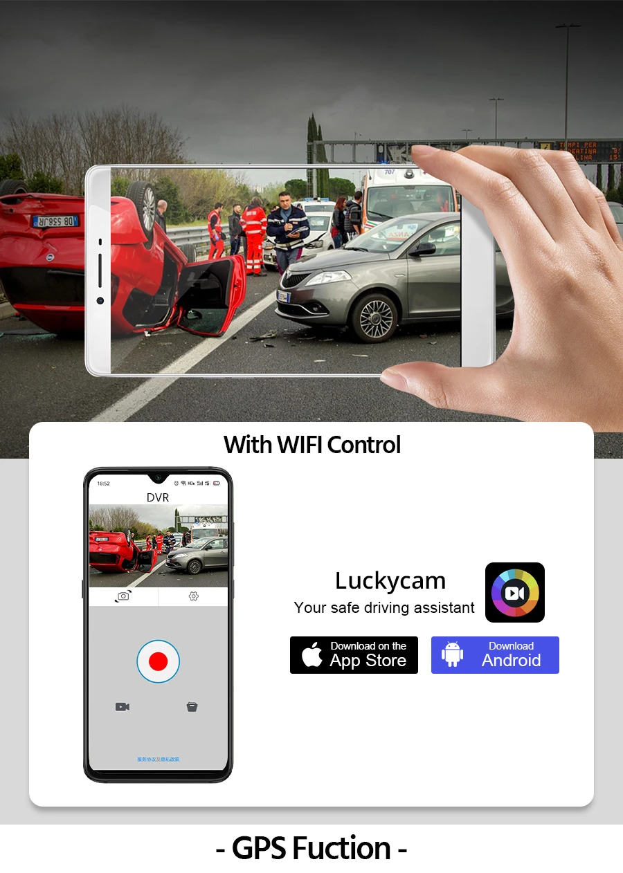 You can control the DVR by connected mobile phonevia WiFi, like recording video, the file recorded video from the overwriting.taking photo, playback preview,parameter settings, etc.