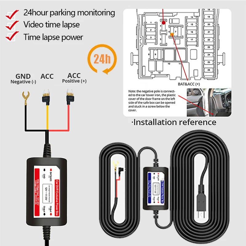 Use the buck line to not occupy the cigarette lighter interface. First, connect the negative pole(black line) of the buck line to the ground of the car fuse box; Secondly, if you want to continue monitoring after parking (the DVR works 24 hours), connect the positive pole(red line) of the buck line to the BAT interface of the car fuse box; If you want to stop monitoring after parking (the DVR does not work after parking), connect the positive pole of the buck line to the fuse box ACC interface.