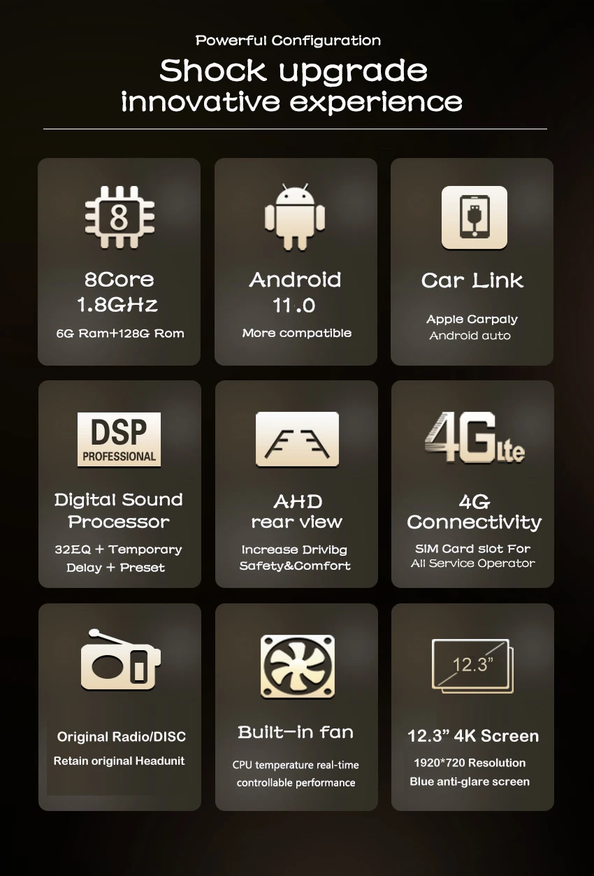 3) Support GPS Navigation , Bluetooth , Picture -in -picture,Split-screen Multitasking, Steering Wheel Control.