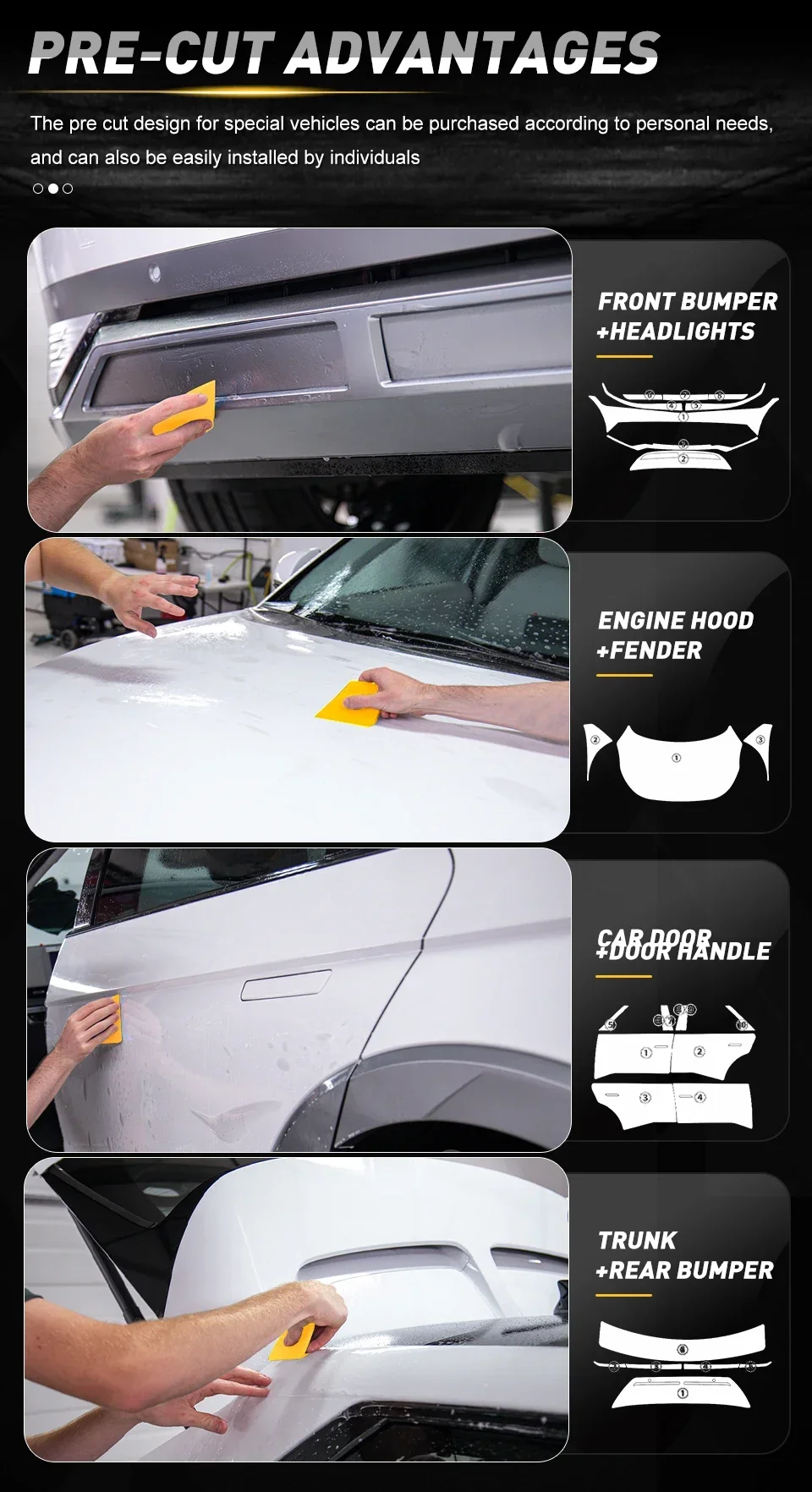 1) This product takes a long time to install, we recommend having a professional Car Wrapper installed