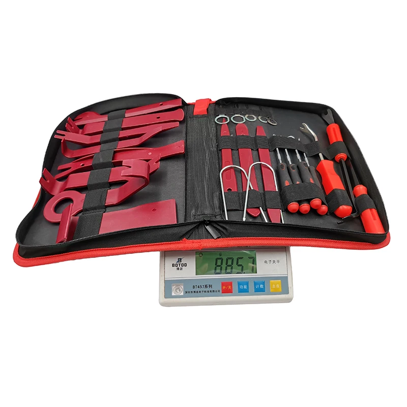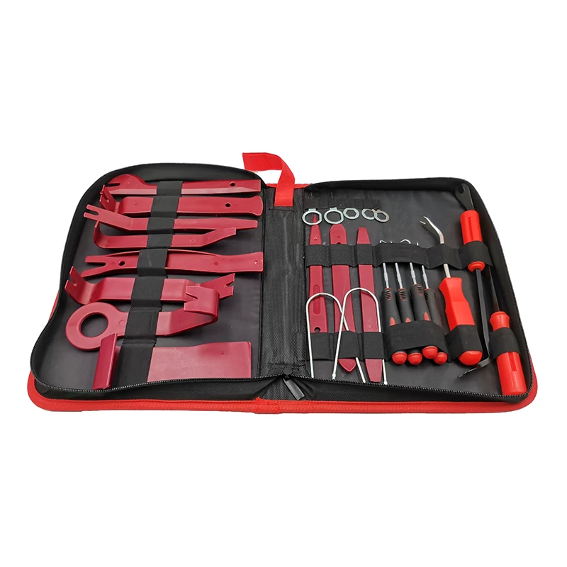 *11pcs interior trim disassemble tools, 3pcs release tools, 4pcs stereo removal tools, 3Pcs Car terminal removal tools,4pcs hose removal hook and a portable storage bag.
