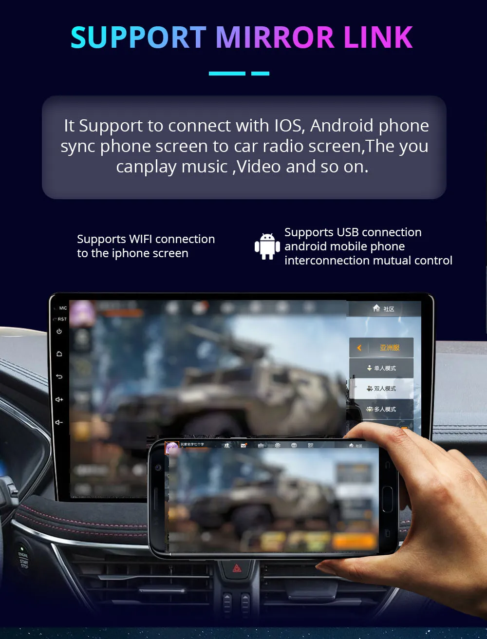 Function: SupportWIFI/Bluetooth/Mirror Link/MP3/MP4/Music/Video/Network