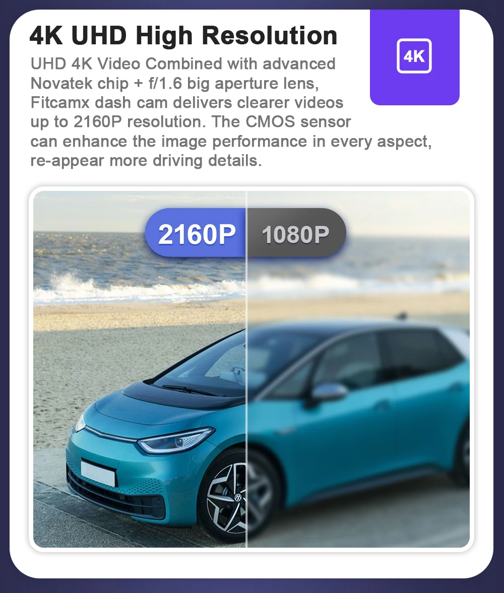 UHD 4K Video Combined with advanced Novatek chip + f/1.6 big aperture lens, Fitcamx dash cam delivers clearer videos up to 2160P resolution. The CMOS sensor can enhance the image performance in every aspect, re-appear more driving details.