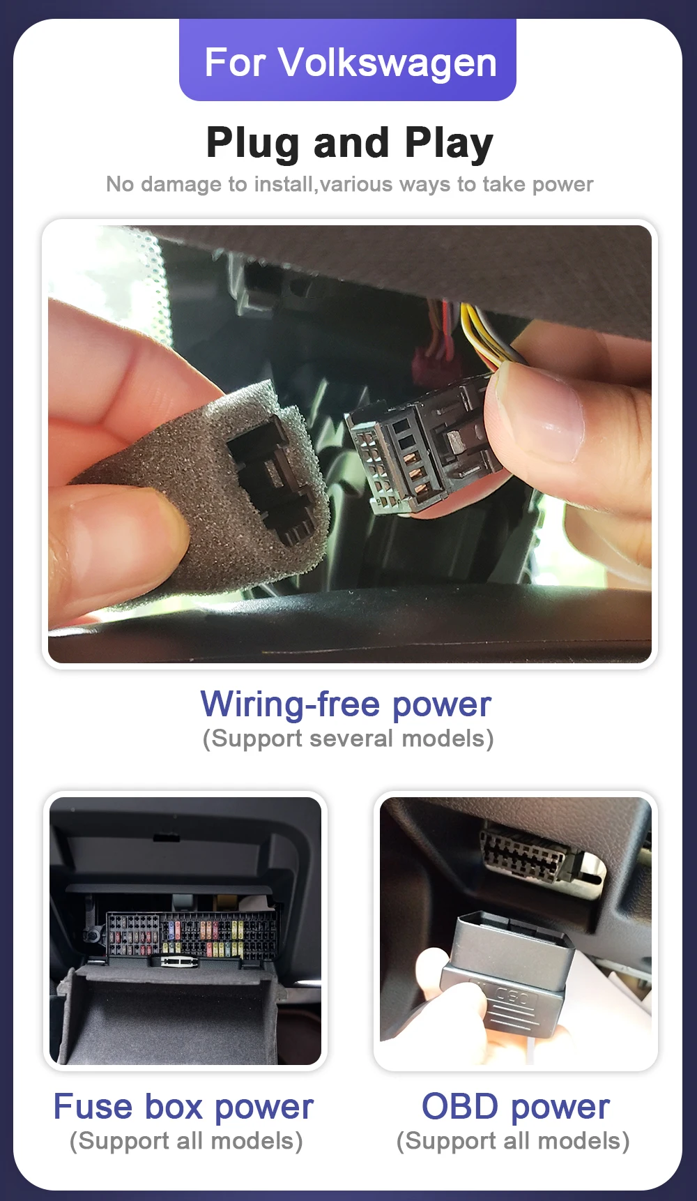 No damage to install, various ways to take power. It takes power from ACC sensor. The plug and play cable is sent by default, if you need to replace the fuse box cable or OBD cable, please contact us before sending.