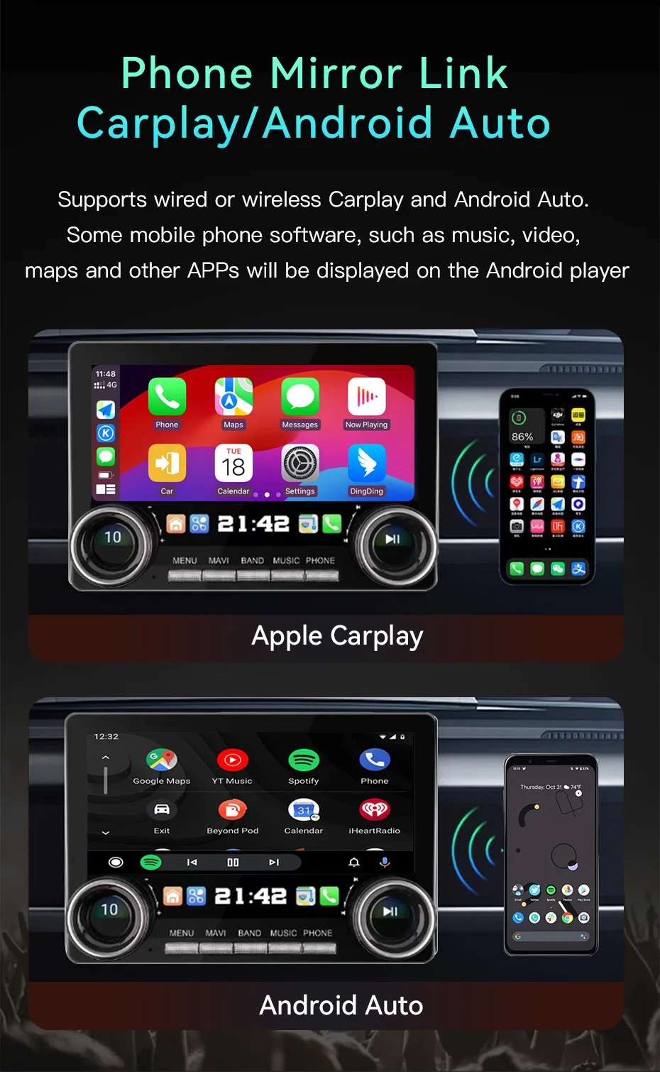 Support Apple wire and wireless Carplay and Android Auto, mobile APP, music, maps, etc. will be displayed on the Android player