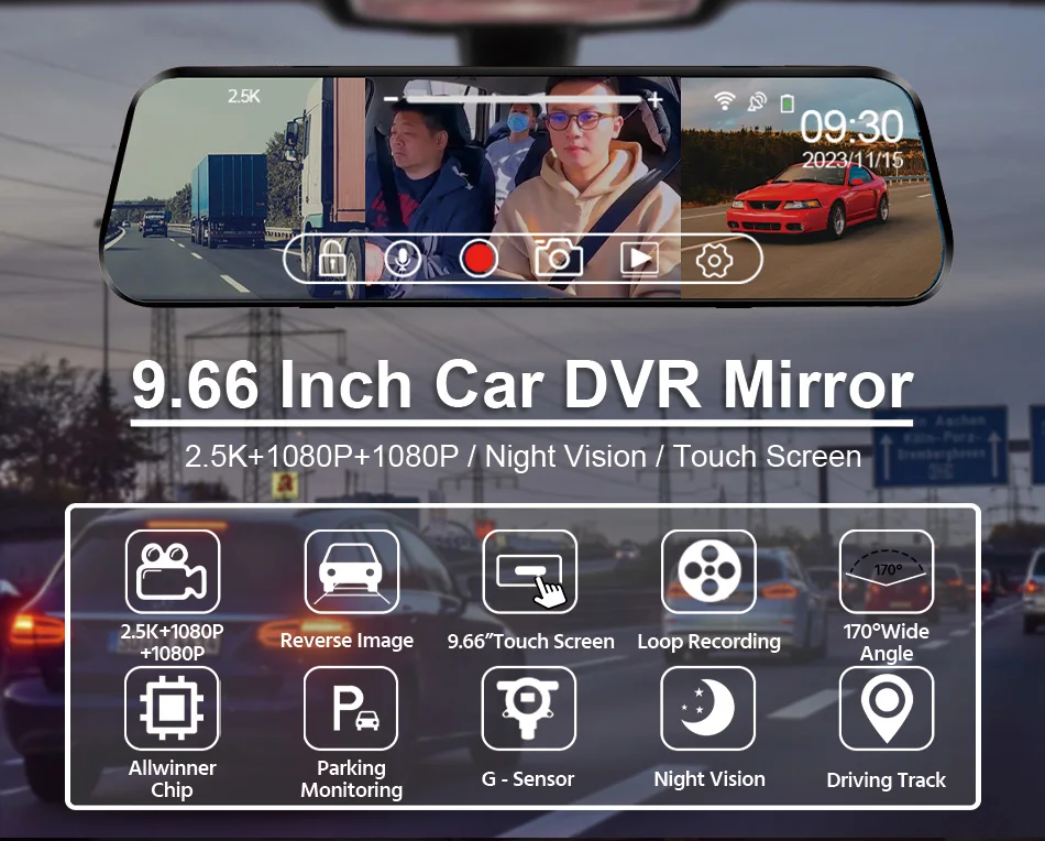 In addition to front and rear view, you can also observe everything that happens inside the car.You can choose a different screen viewing mode, front and rear view ,car inside and front view, large wide-angle high-definition picture quality, wider vision, driving more secure.9.66 Inch Touch Screen