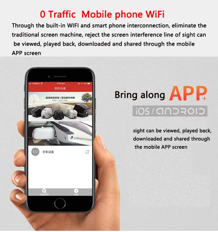 0 Traffic Mobile phone WifiThrough the built-in WIFI and smart phone interconnection , eliminate thetraditional screen machine , reject the screen interference line of sight canbe viewed , played back , downloaded and shared through the mobile
