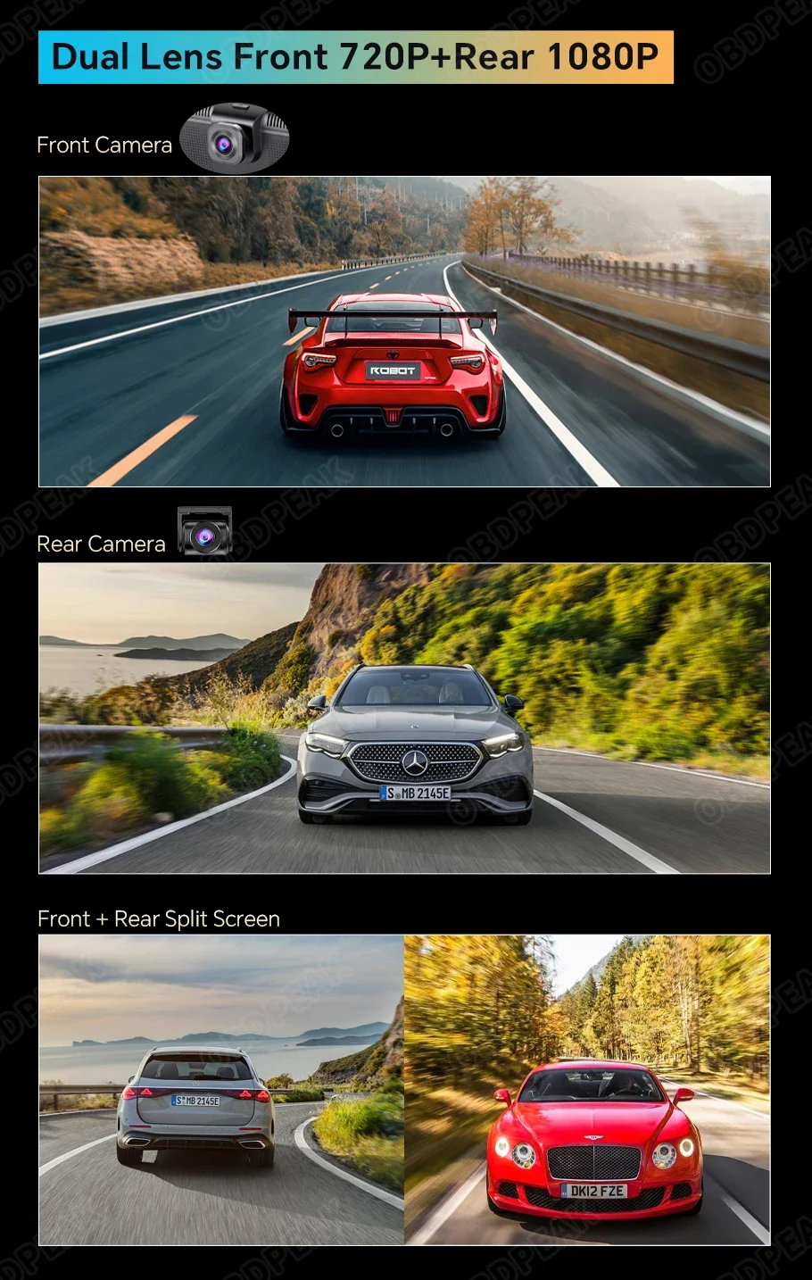 The OBDPEAK K50 has a crazy built-in 3 system, Android 13 system/Carplay system/Android Auto system, and has added an Dual Lens to meet all your car driving needs!