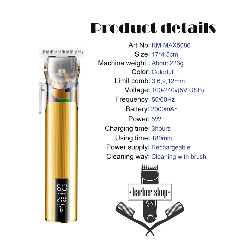 Kemei MAX5086 Professional Hair clipper Rechargeable Hair Trimmer Cord or Cordless Barber clipper Electric Hair Cutting Machine