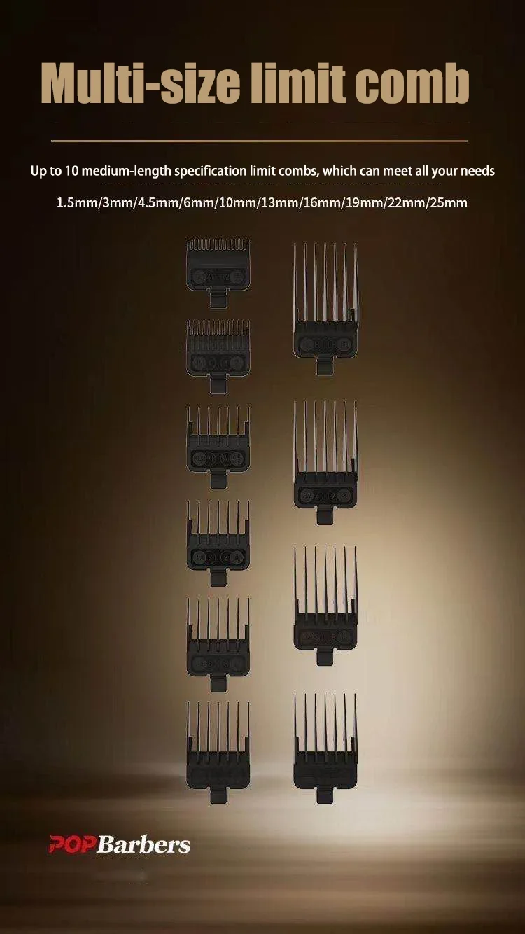 7. Package Includes: Blade screwdriver+clean brush+blade adjustable tool+blade protector+charger adapter+10pcs kinds of limit combs
