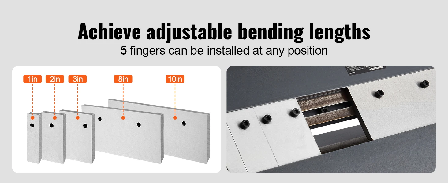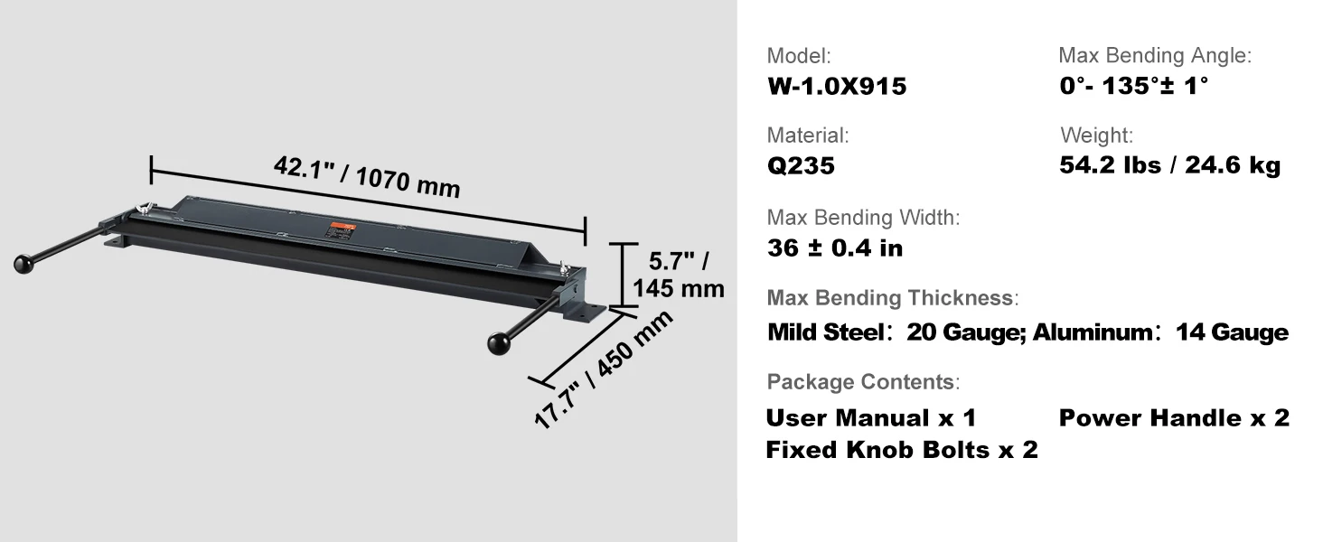Sturdy and Resilient Construction:Crafted from high-quality Q236 steel, this metal brake ensures durability and long-lasting performance; Its rugged design makes it perfect for both stationary installation on a workbench or easy transport to job sites Adjustable Bending Range:Offering a flexible bending range from 0° to 135°, this metal brake adapts to a variety of bending needs; Whether for light metals or heavy-duty sheets, it provides precise bends for all types of metalworking projects Modular Design for Versatile Operations:With 10 detachable modules, including sizes from 1"" to 4"", this brake is designed for intricate metal operations; It’s ideal for tasks like reinforcing floor channels or creating truck headboards, delivering excellent flexibility for a variety of applications Ideal for Complex Metal Bending:Built with a detachable module design and 0.39"" thick metal with a 21HRC hardness, this brake easily handles bending 20-gauge low-carbon steel and 14-gauge aluminum; It’s an essential tool for precision work in factories and workshops Wide Range of Applications:This sheet metal brake is capable of bending stainless steel, copper, aluminum, iron, and more; Perfect for professional tasks, it supports heavy-duty and light-metal projects, making it indispensable for workshops, factories, and DIY enthusiasts