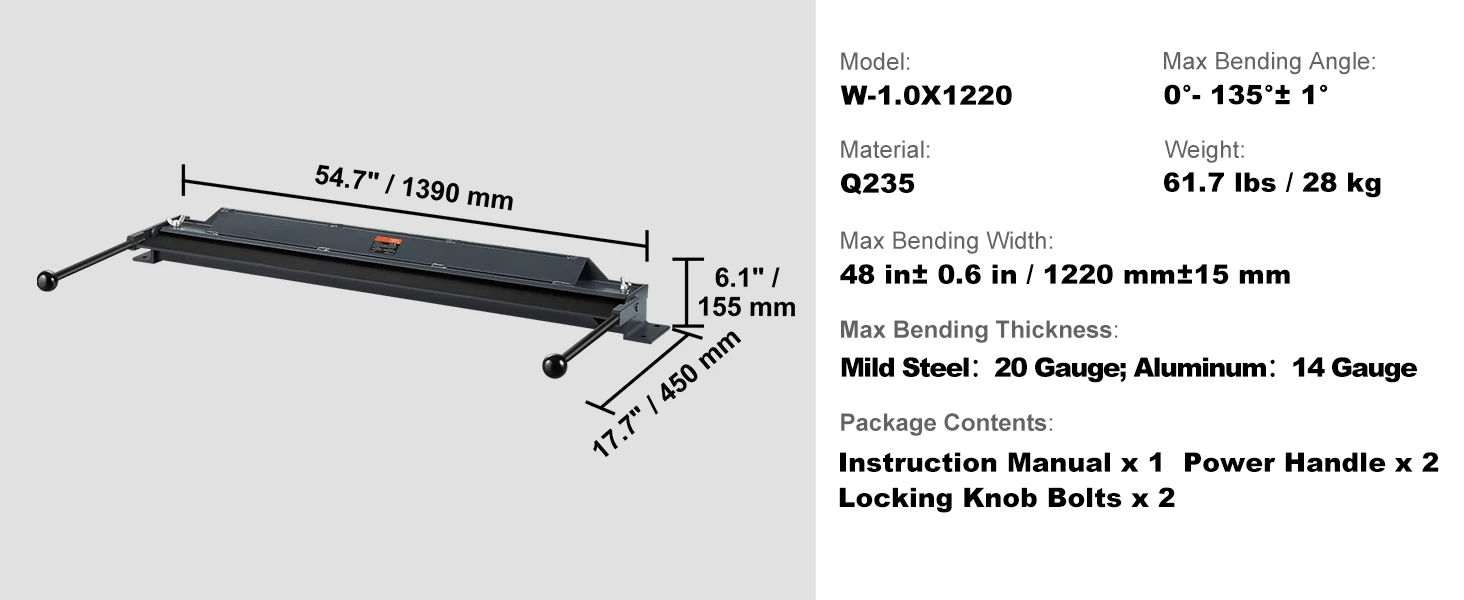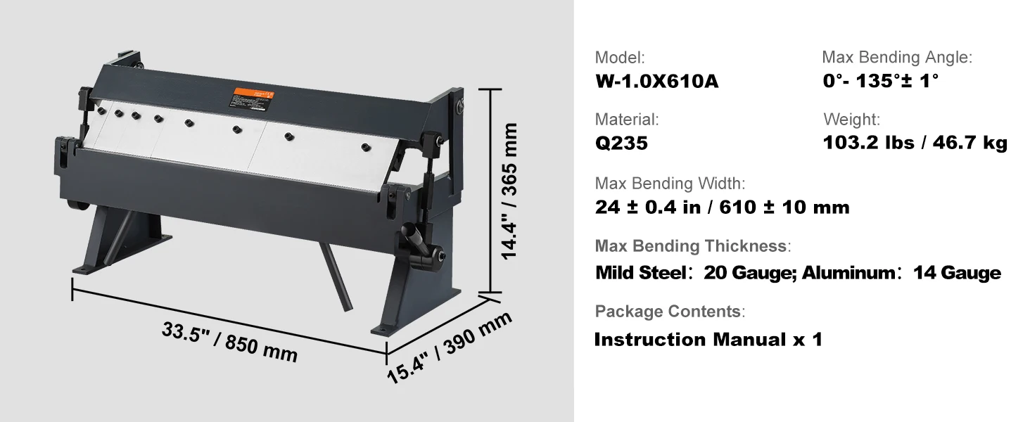 Max Bending Width: 610 ± 10 mm / 24 ± 0.4 inches, Weight: 46.7 kg / 103.2 lbs, Dimensions (L x W x H): 850 x 390 x 365 mm / 33.5 x 15.4 x 14.4 in, Maximum Bending Angle: 135° ± 1° / 0° - 135°, Material: Q235, Max Bending Thickness: 20 Gauge Low Carbon Steel; 14 Gauge Aluminum, Item Model Number: W-1.0X610A