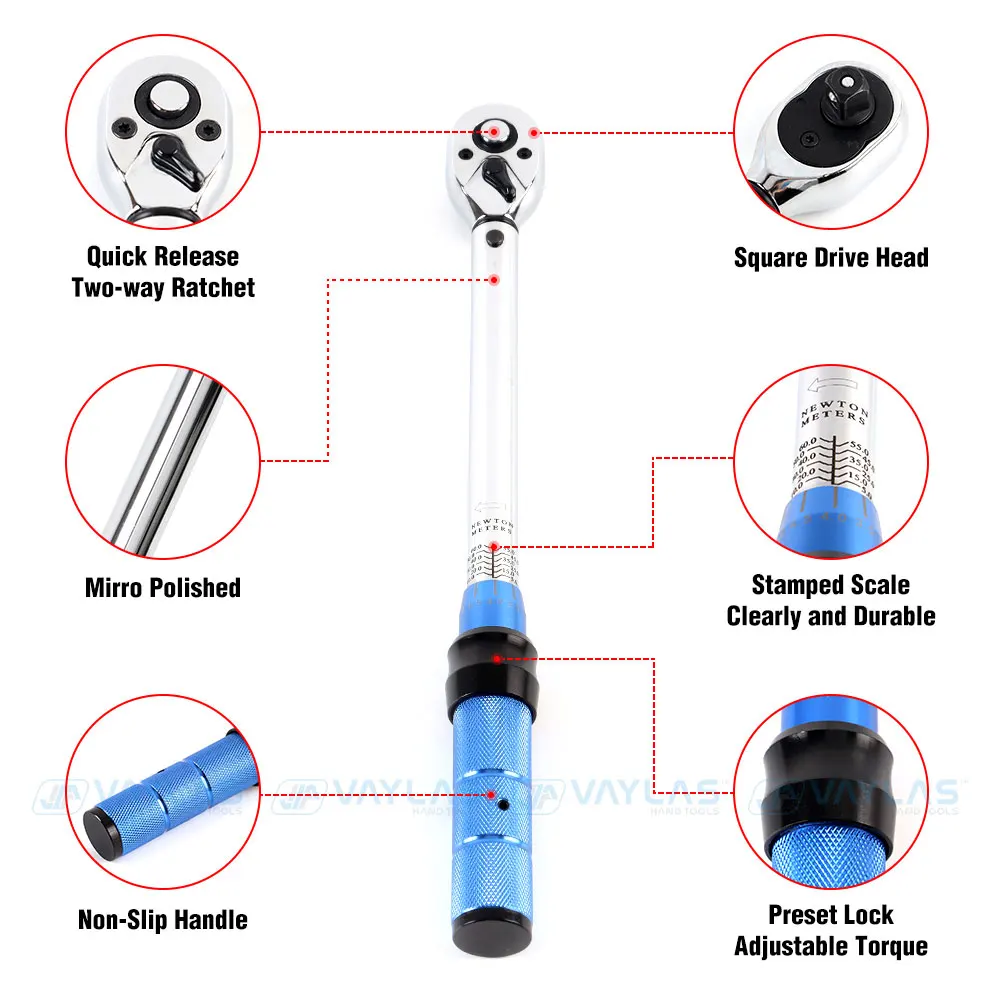 VAYLAS Torque Wrench 3/8'' Square Drive Head Adjustable Torque Spanner 5-25N.m/5-60N.m Hand Tools for Car Repair and Bike Repairing