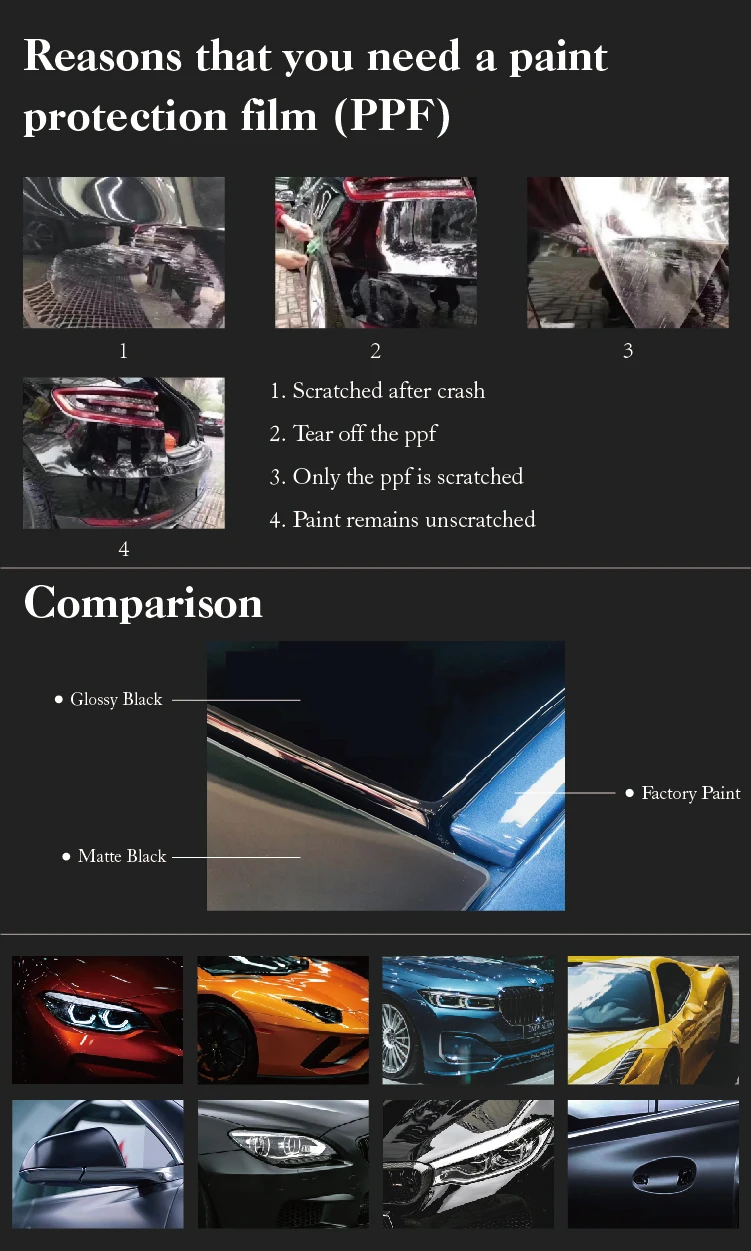 Car Paint protection film is a polymer or polyurethane film that is placed over the car’s body panels in order to protect them from scratches, UV rays, rock chips, and other road debris. It can cover the whole front bumper the entire hood, side mirrors, and rear bumper. Basically, all of the body panels that are considered “high impact” areas that are vulnerable to most damage.