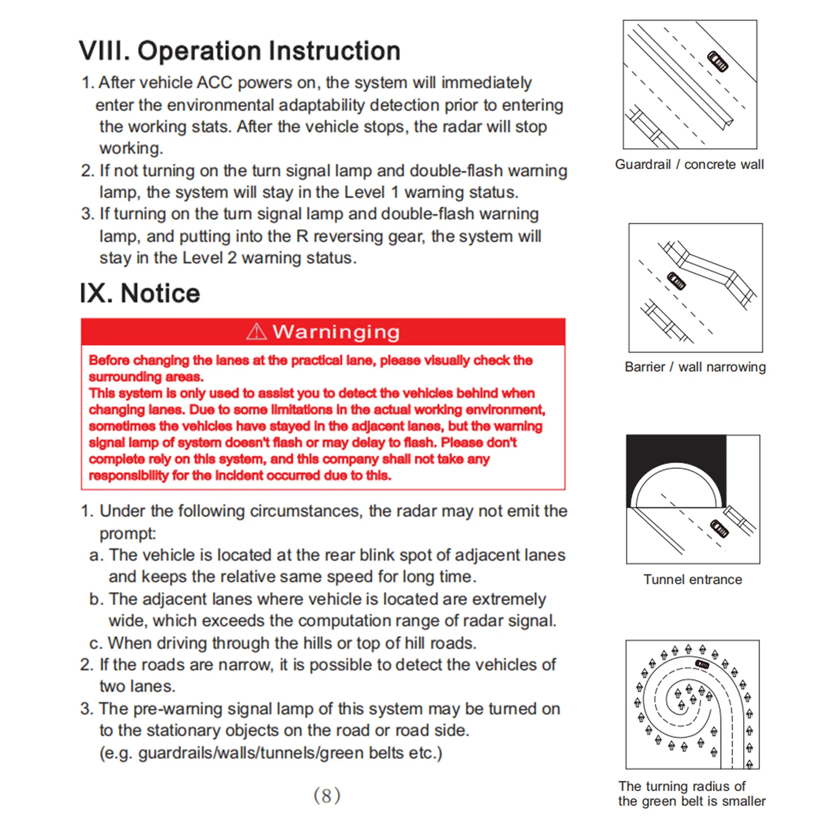 1.BSD Pre-warning (Detection range: Horizontally 4 meters/13.12ft, longitudinally 15 meters/49.21ft). Working Logic: Vehicle's own speed is higher than 10Km/Hour, BSD pre-warning mode is started: