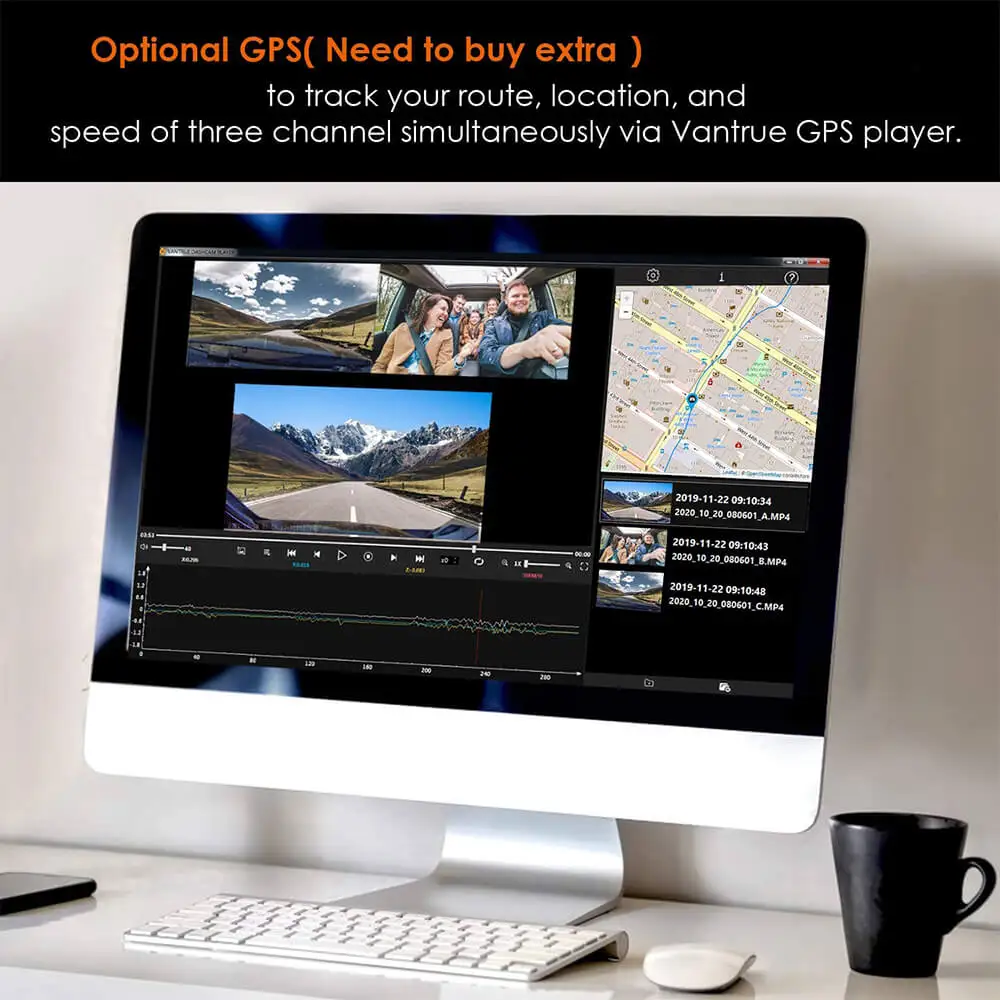 The GPS function let you can track your route,location and speed of three channel simultaneously via Vantrue GPS player.