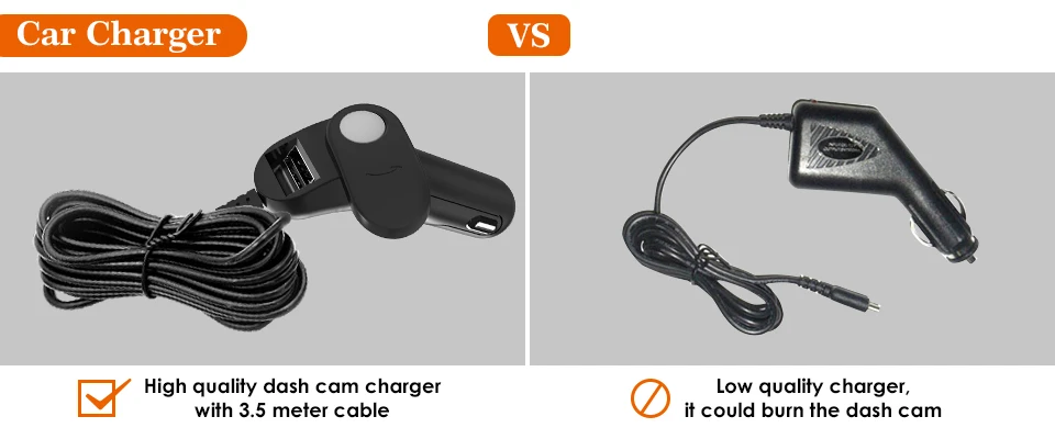 Other products: Low-quality charger, not designed for the dash cam. It only provides 5V 1A, and a short cable.