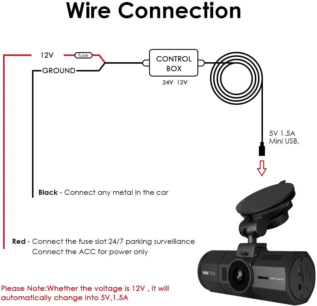 Vantrue: Using VANTRUE's high-quality original charger, is designed for the dash cam.it provides 12/24 to 5V 1.5A.It also has a 3.5-meter cable and USB port.