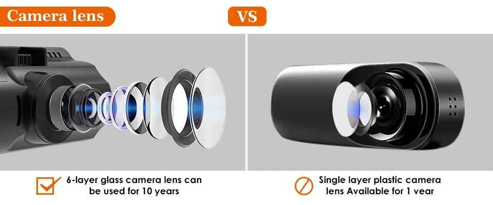 Vantrue: Using a 6-layer glass camera lens can be used for 10 years. The video can be very clear under hight temperatures.