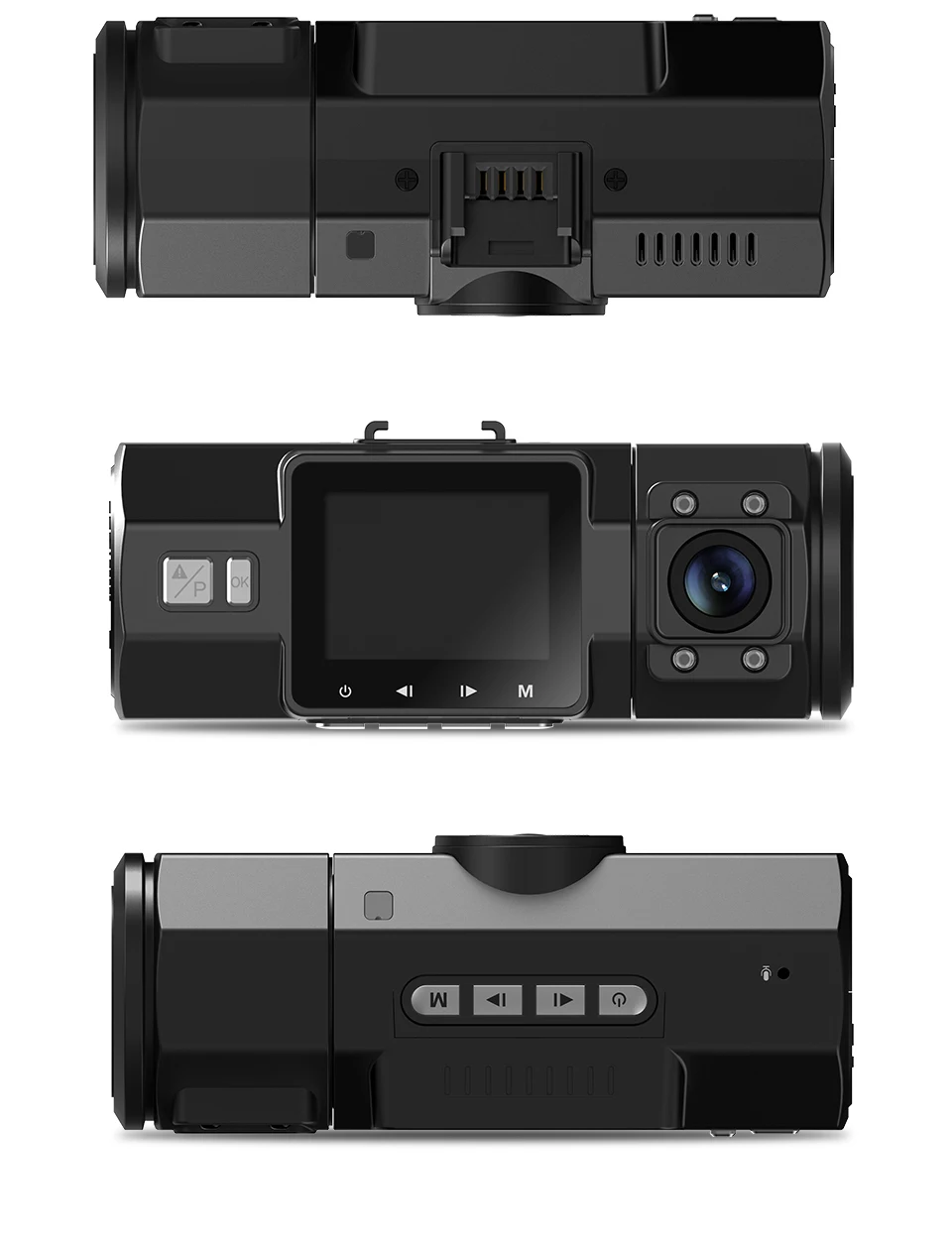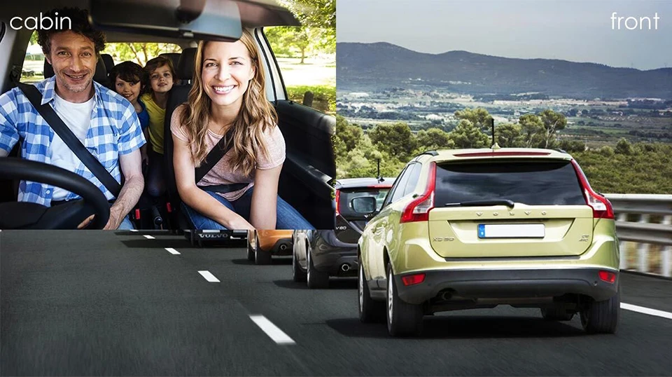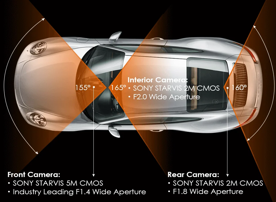 With F1.4 aperture 6-glass lens observing road front,F1.8 6-glass lens observing behind of your car,and 4 IR LED lights facing the vehicle occupants,it ensures super night vision even in dark situations.