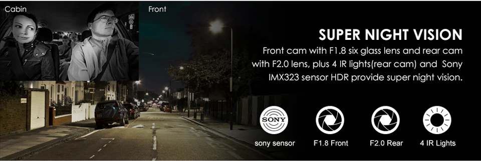 【Infrared Night Vision w/Sony Sensor】The interior facing camera utilizes a Sony sensor, 4 IR LED lights and f/2.0 aperture, which can handle low light conditions and ensures flawless video footage even when the passenger cabin is dark. F/1.8 6-glass lens front facing cam and unique HDR video system automatically balance the light and dark areas of the video.
